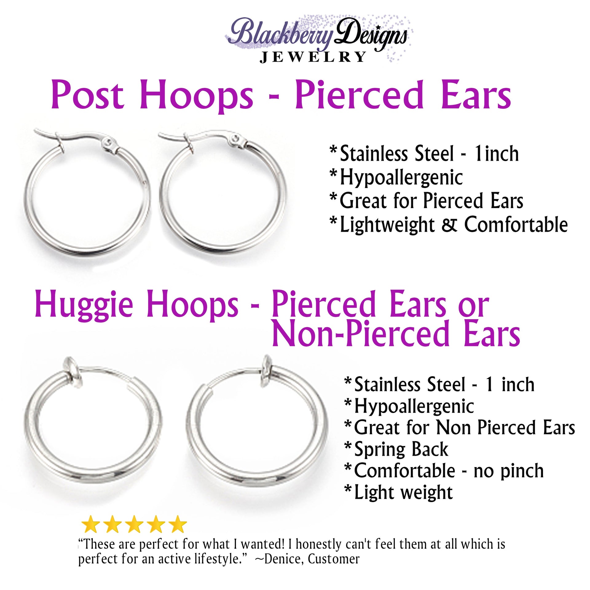 - Huggie Style Spring Hoops, 1" for Pierced and Non Pierced ears