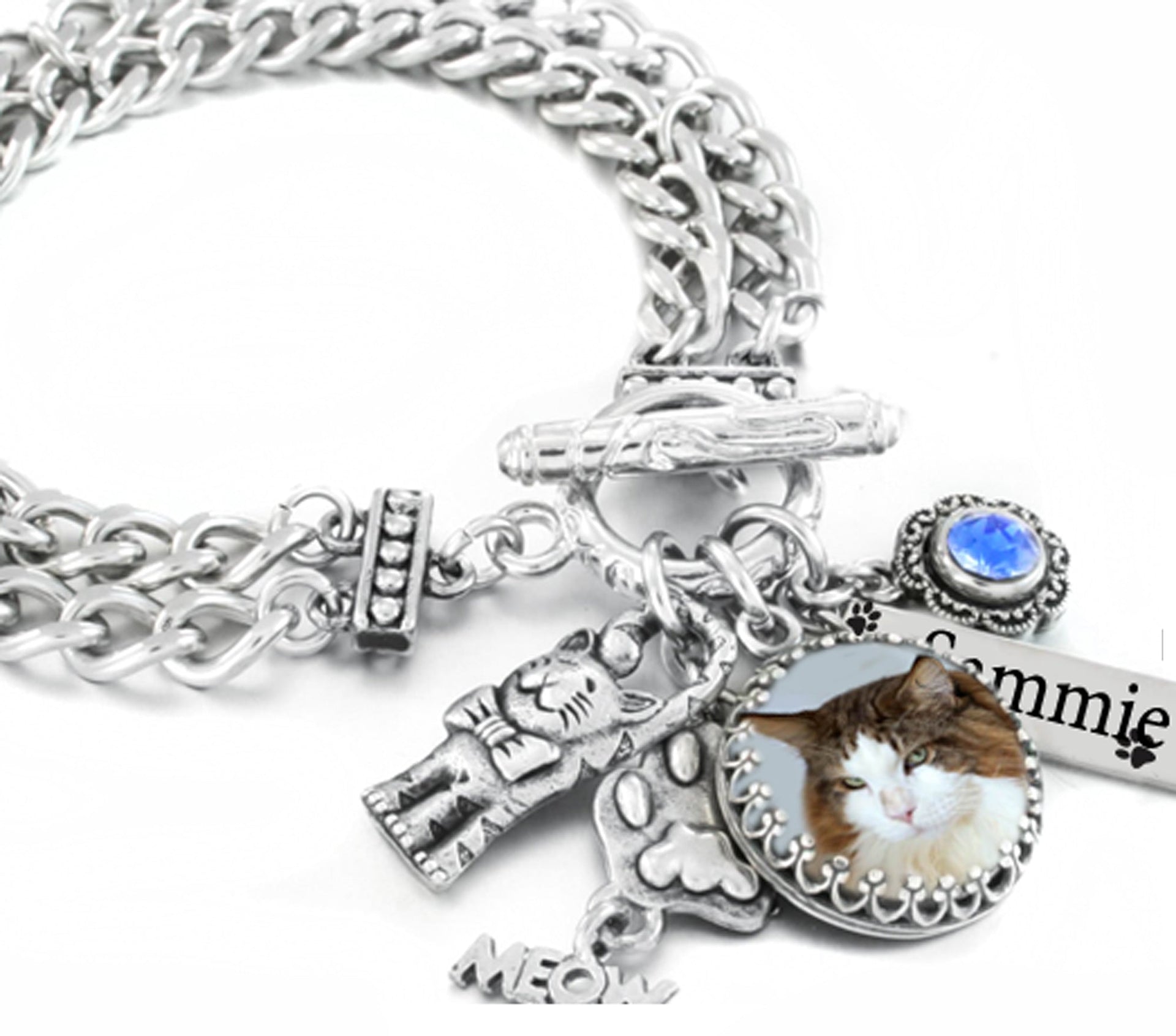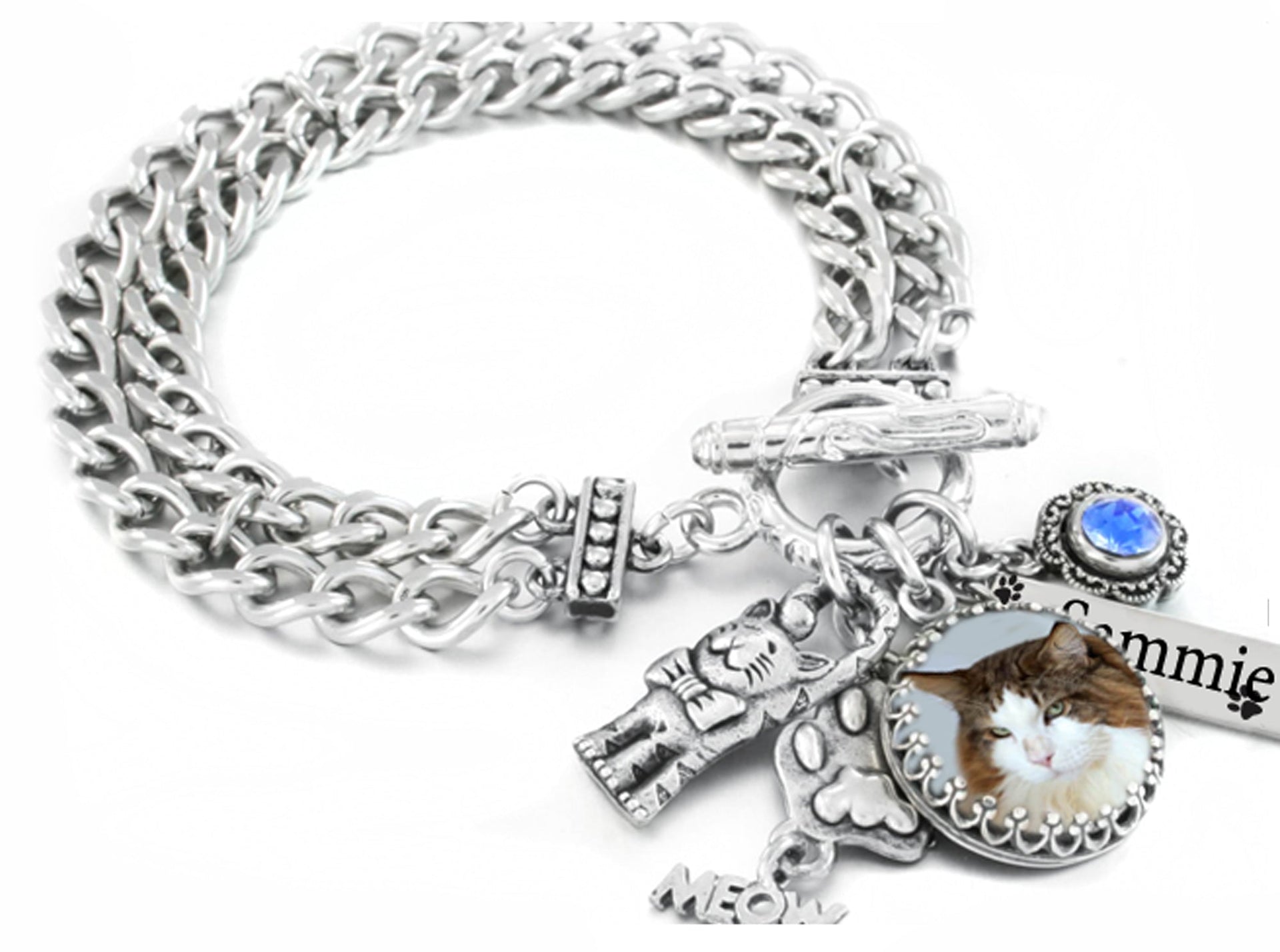 Your cat is a precious member of your family. Hold them close to your heart with our personalized cat photo bracelet. Includes your custom cat photo, silver charms, engraved charm, and birthstone crystal charm. Please be sure to include only a high quality photo that is uncropped, this memorial bracelet allows photoshop work on one photo only.  You'll find further instructions within the images.  Handcrafted in Timeless Stainless Steel because how its made matters.