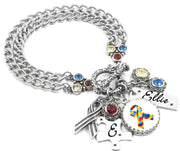 Timeless Stainless Steel is at the forefront of our Personalized Autism Awareness Bracelet, a great way to support a loved one with Autism. Puzzle Piece and Awareness Ribbon charms, with Colorful Crystals in Yellow, Red and Aquamarine. Irresistible stainless steel that will never turn color or tarnish for a Lifetime Warranty.