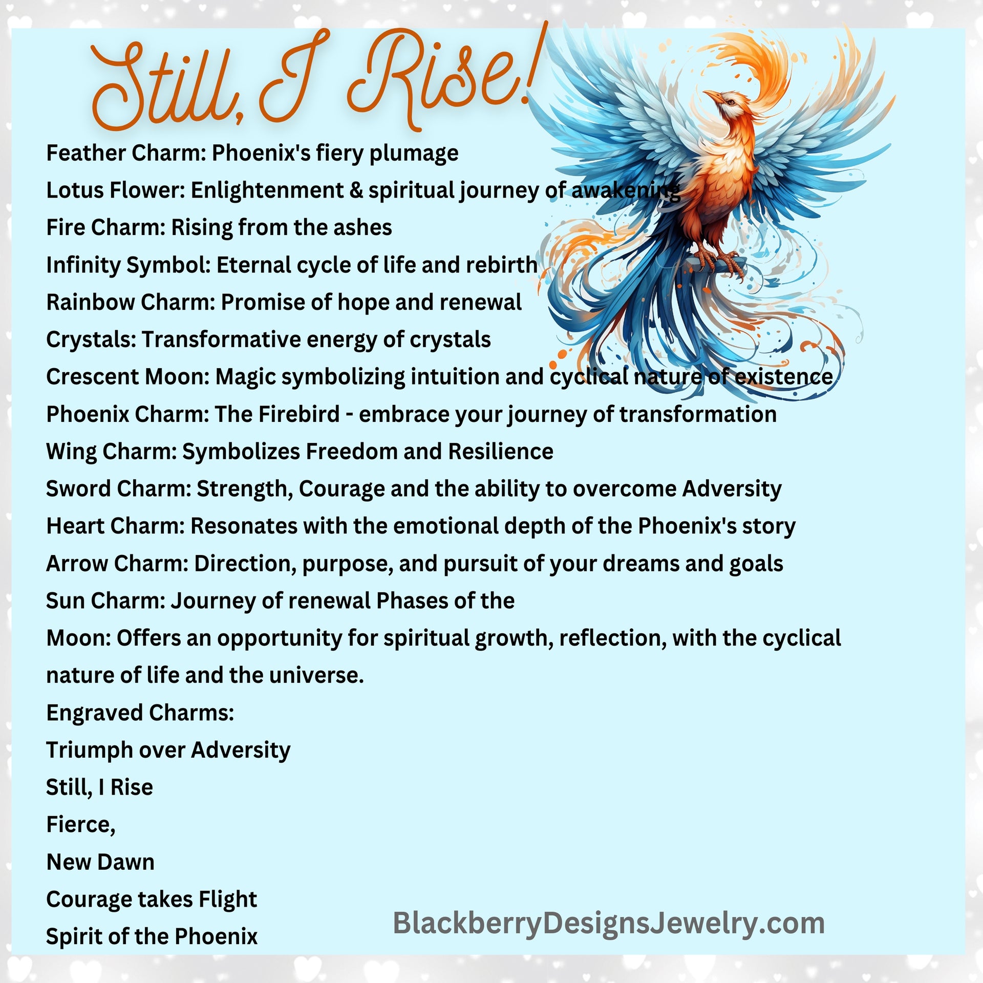 • 5 Engraved charms, Fierce New Dawn, Still I Rise, Spirit of the Phoenix, Triumph Over Adversity, Courage Takes Flight