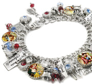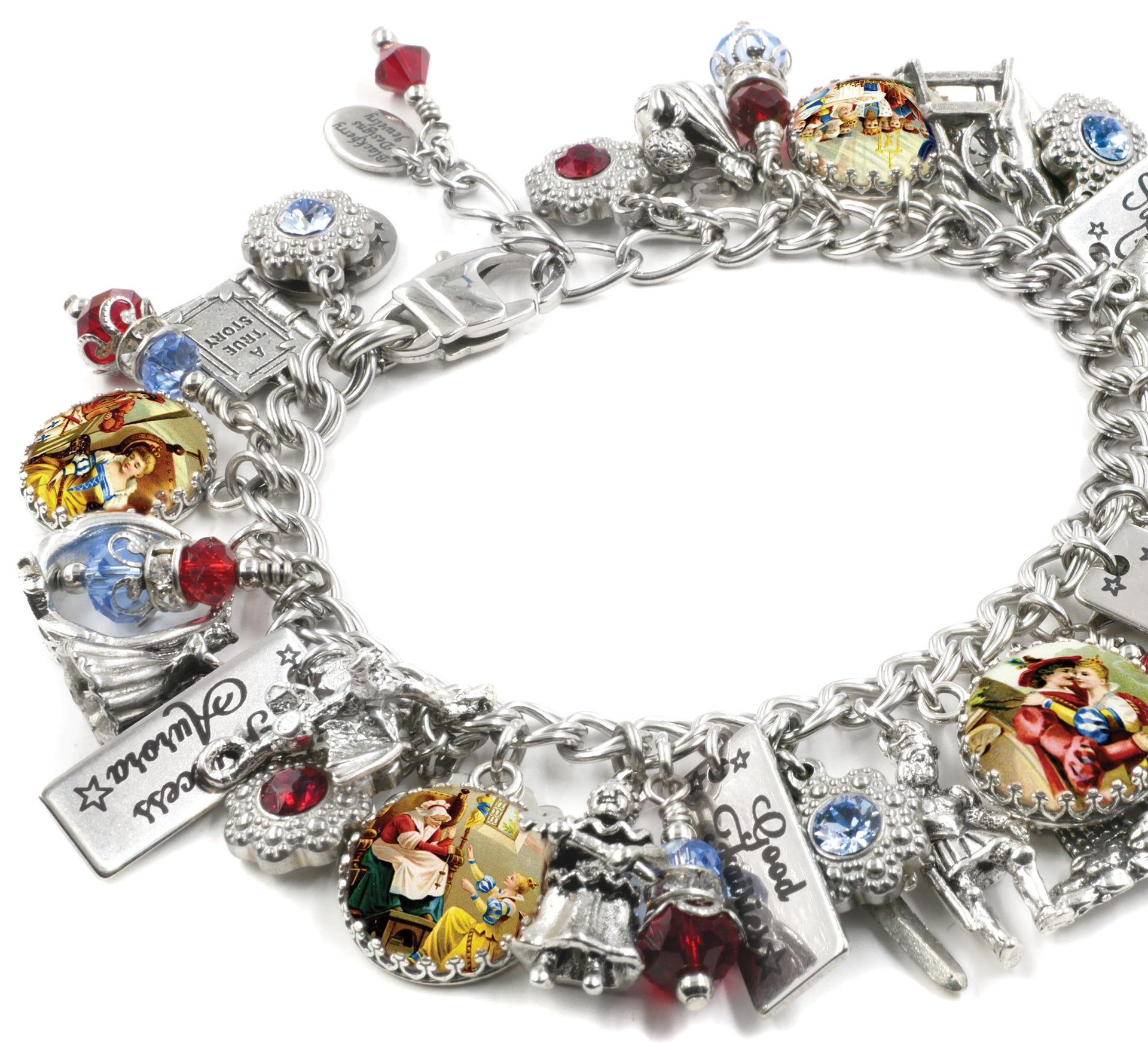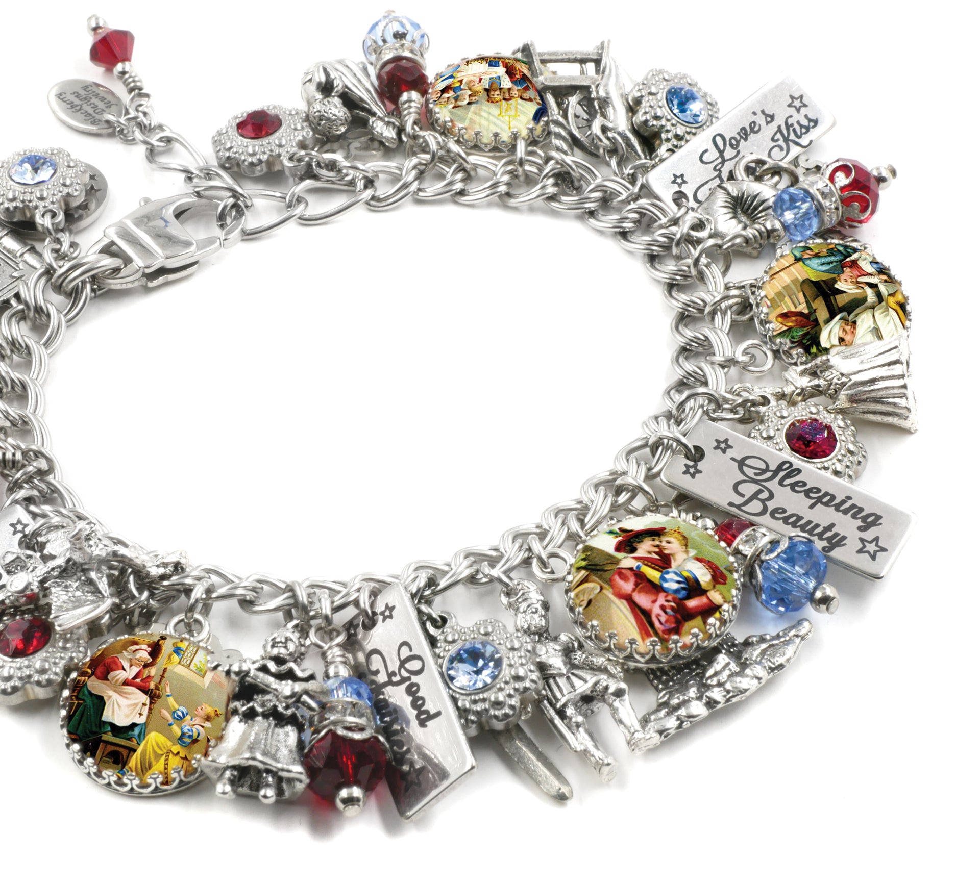 You will have magic with your own Sleeping Beauty Charm Bracelet. Vintage images from the early 1900's surround beautiful sleeping beauty charms, Colorful crystals in Ruby and Aquamarine and engraved charms. Artist one of a kind jewelry crafted in timeless stainless steel.