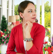 This One of a Kind Valentine Heart Charm Bracelets makes for a beautiful and unique piece of jewelry that would make a perfect gift for someone special on Valentine's Day, Anniversary Gift, or Birthday Gift.  The vintage valentines images and various charms add a nostalgic and romance to the jewelry with the Never Tarnish Silver™ and sparkling Ruby and Turquoise Austrian crystals make it a high-quality and durable Valentines Charm Bracelet. Included are 30 Valentines Charms, Red Crystal Hearts, and Vintage Ladies from Valentines around 1920's.  Our Captivating Quality of this Valentines Charm Bracelet is meticulously artist created in our California Studio.  She'll Love it as a keepsake and wear her Valentines Charm Bracelet for a lifetime.