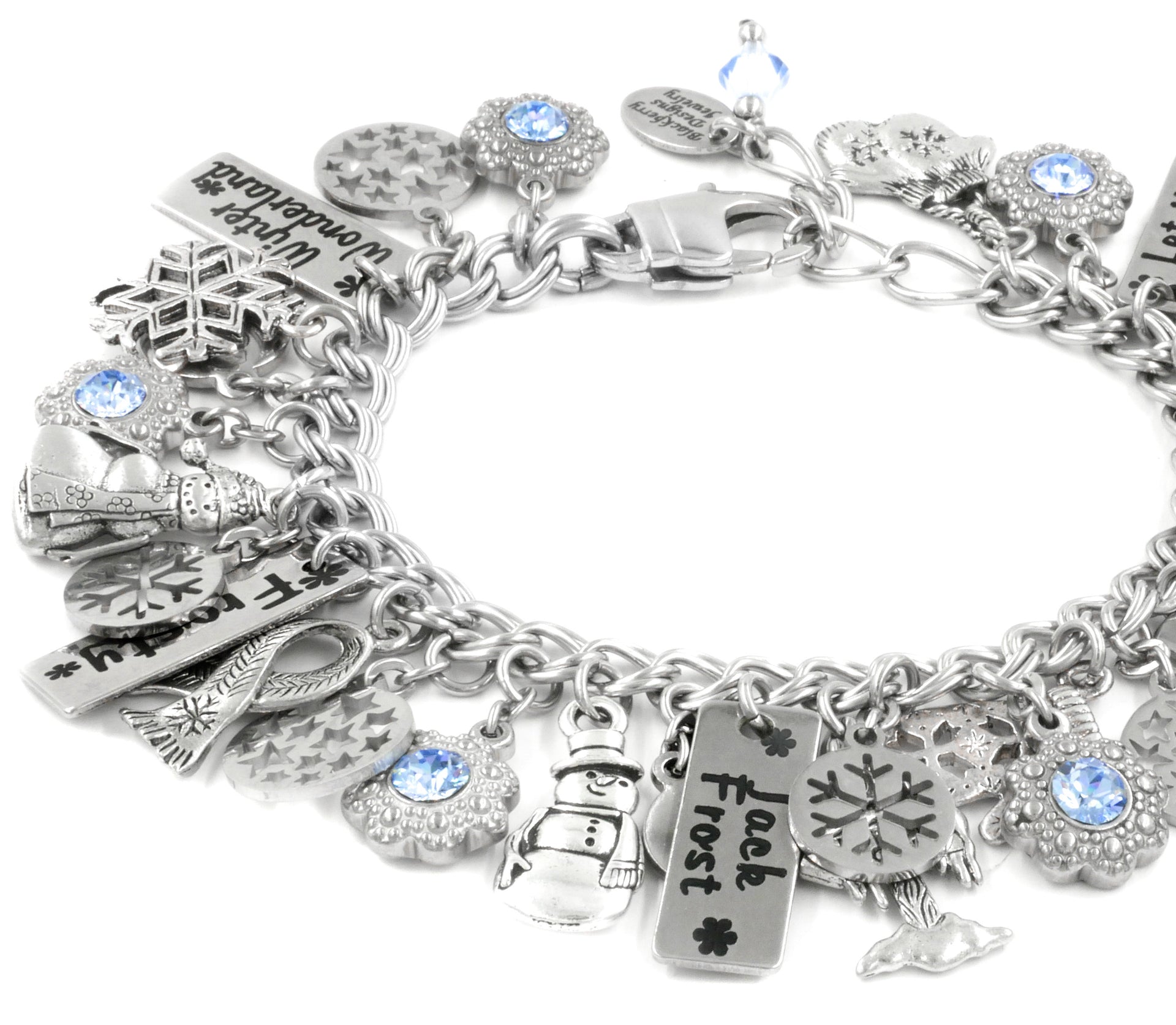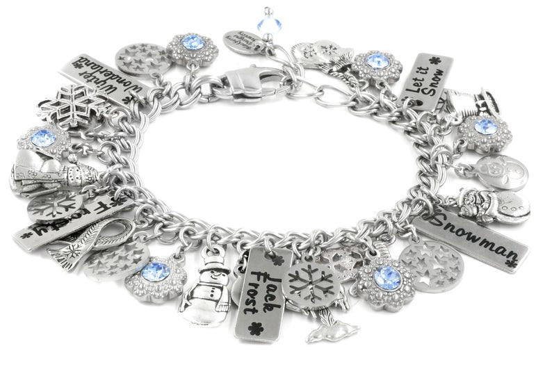 Snowman ladies and child's winter charm bracelet is handcrafted by our artists in the USA of non tarnish stainless steel. Loaded with snowflakes, mittens, snowmen, north pole and lots of lovely charms. These beautiful bracelets look great by themselves or as a layering piece, heirloom quality created to last a lifetime.