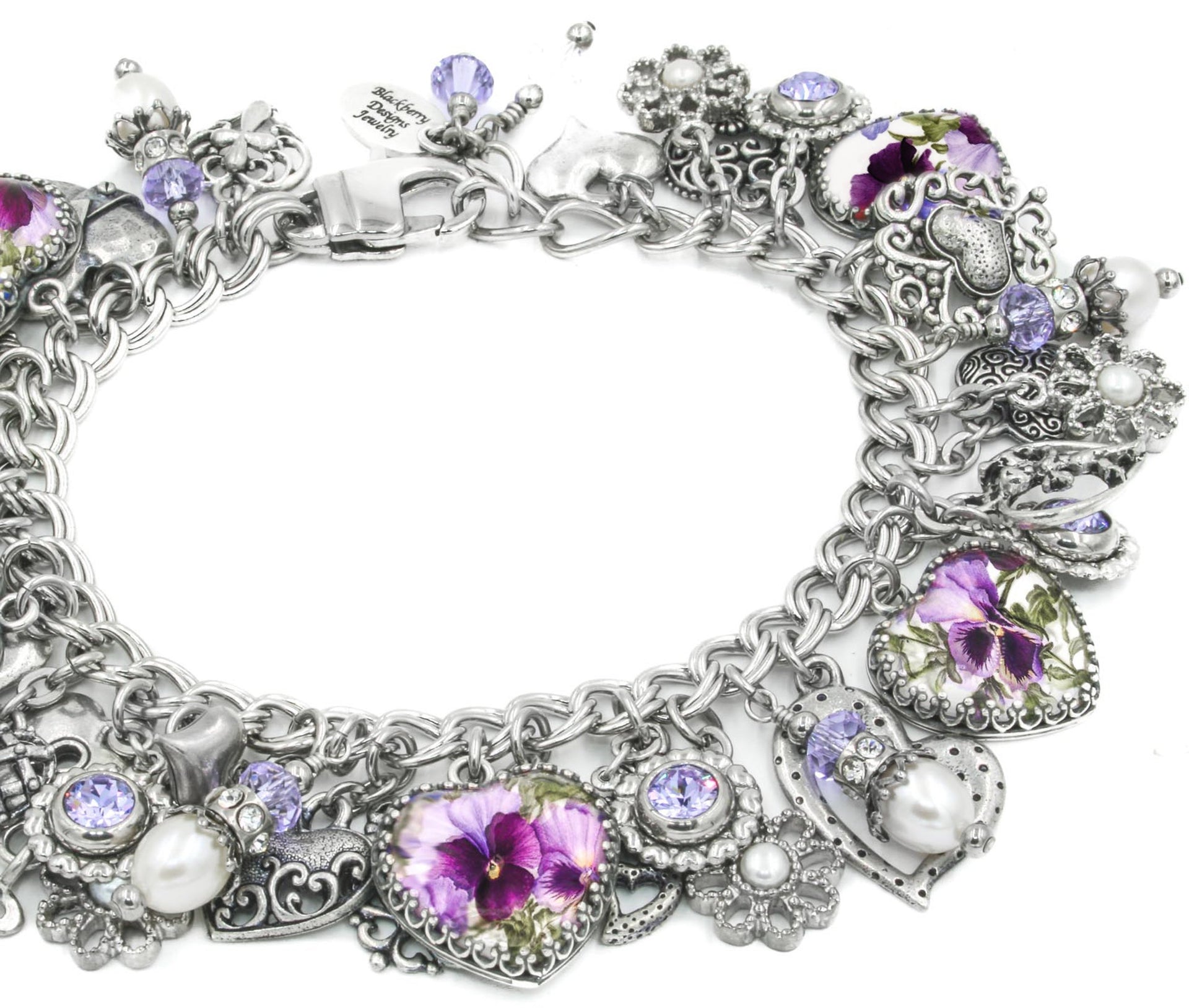 The wonderful look of Shabby Chic with my Amethyst Pansy Bracelet created from a vintage china pattern c. 1930's. Top this lovely Amethyst Pansy Bracelet for a great giftr for flower lovers and February Birthdays. Includes fresh water pearls, amethyst crystals, and tons of heart charms makes for the perfect February Birthday Gift for Mom, Sister, and Best Friends plus this lovely piece is sure to be a hit for any occasion.