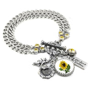 This triple Austrian Crystal silver Sunflower Bracelet is the perfect gift for those that love the Happy Sunflowers. Handcrafted one of a kind with Chocolate and Sunflower Yellow Austrian Crystals, an engraved charm that says "keep your face to the sunshine", Angel with watering can for garden, silver sunflower charm, and a round pendant Sunflower charm with a vintage image in the center.