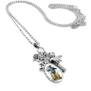 he Scarecrow Necklace is a handcrafted stainless steel pendant designed to celebrate the spirit of Thanksgiving and the fall season. This scarecrow necklace features a charming blue overalls charm paired with detailed silver accents, including a crow and pine cone, making it the perfect holiday charm jewelry to elevate your seasonal style. Crafted from high-quality stainless steel, this lightweight fall necklace offers durability and comfort for all-day wear while showcasing a sparkling Austrian crystal that adds a touch of elegance.