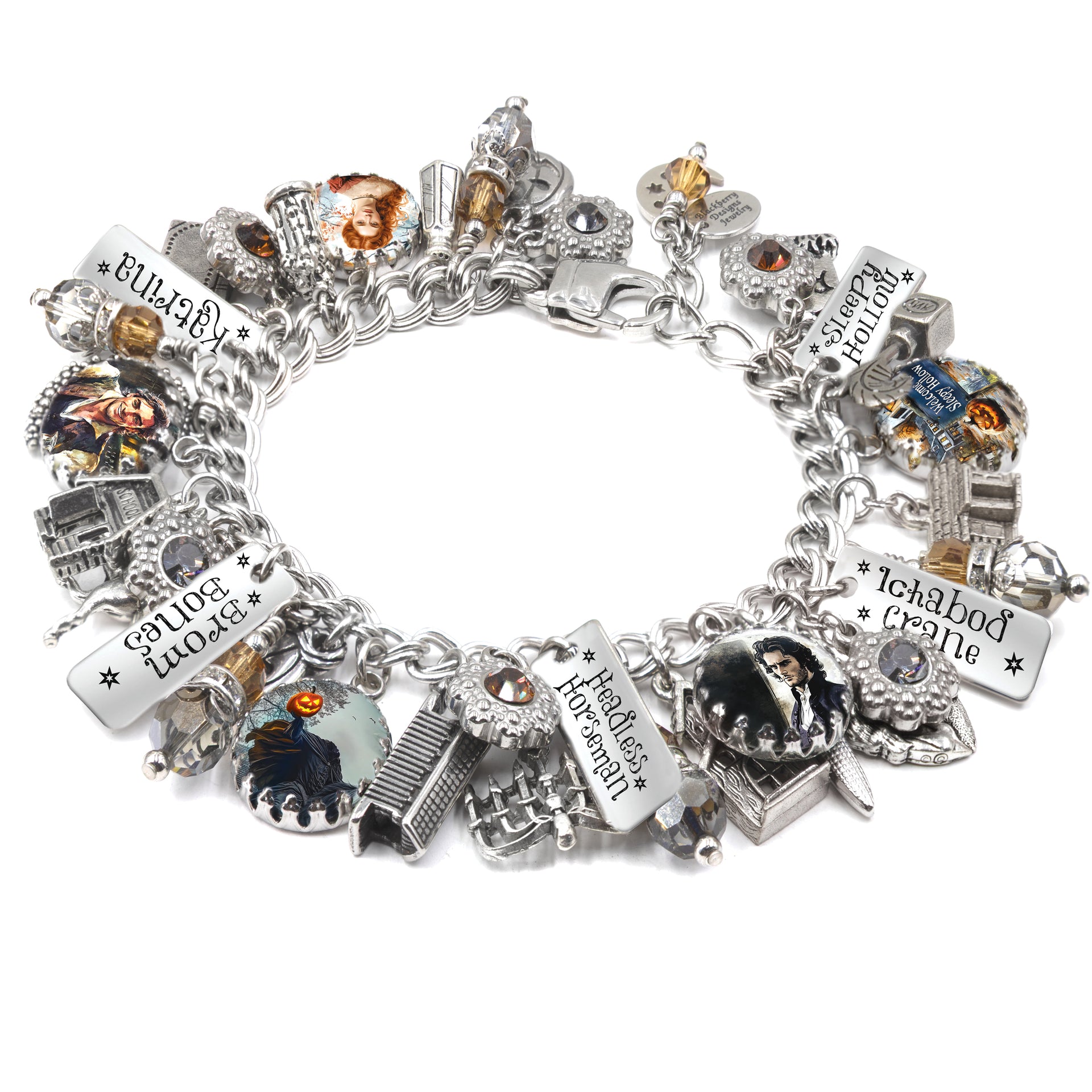 Step into the haunting legend of Sleepy Hollow with this handcrafted charm bracelet. Designed by artist Dea Shelton, it layers detailed charms inspired by Washington Irving’s classic tale — the Headless Horseman, Ichabod Crane, Katrina, and the ghostly bridges and forests of Sleepy Hollow.