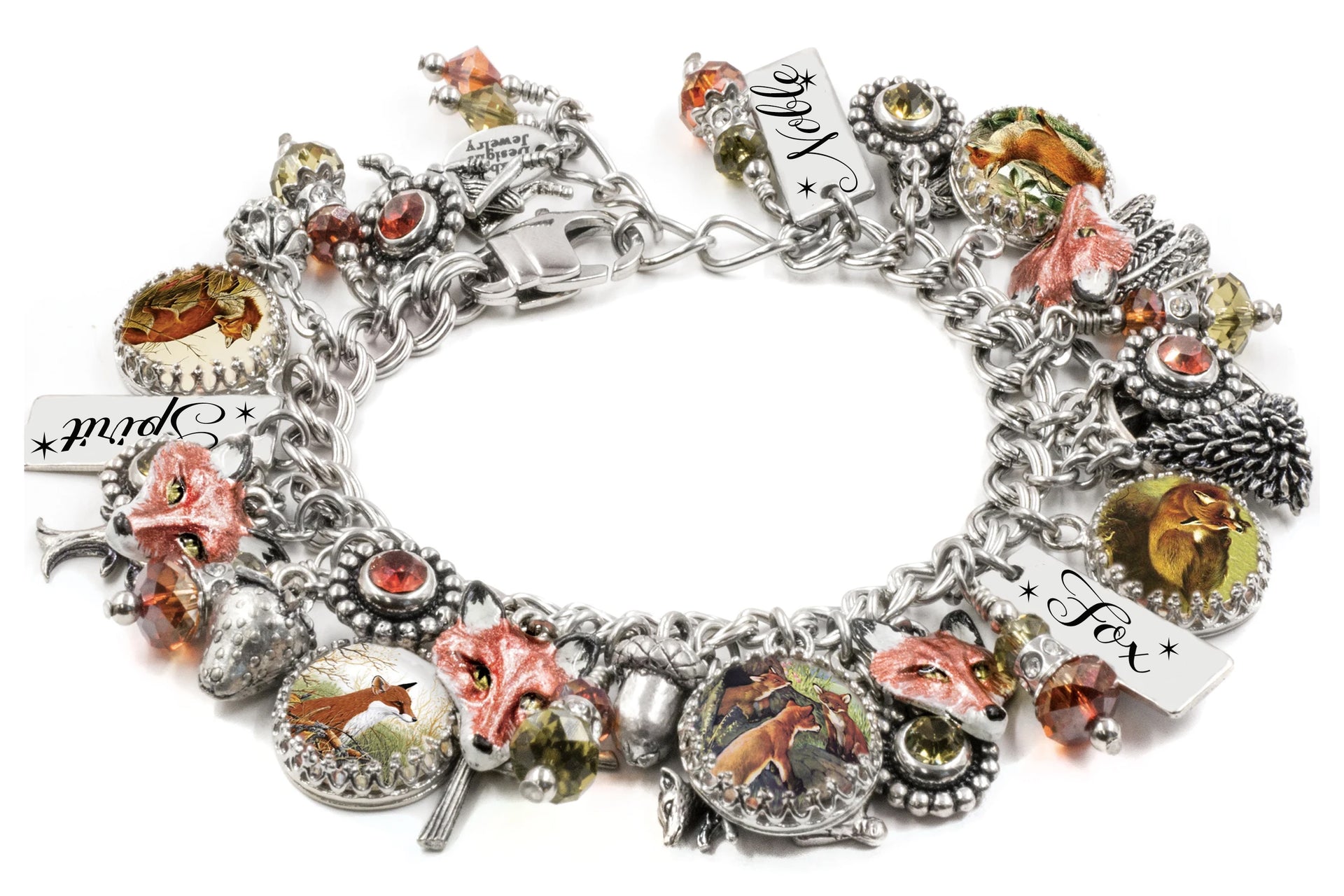 The Noble Fox charm bracelet is created to honor this beautiful wildlife. Foxes have been associated with increased awareness, seeing through deception and the call to be discerning. This beautiful bracelet is created with hand enameled fox faces, 5 vintage images of foxes, lots of charms, and Sparkling crystals in forest green and Copper. Artist crafted in timeless stainless steel.