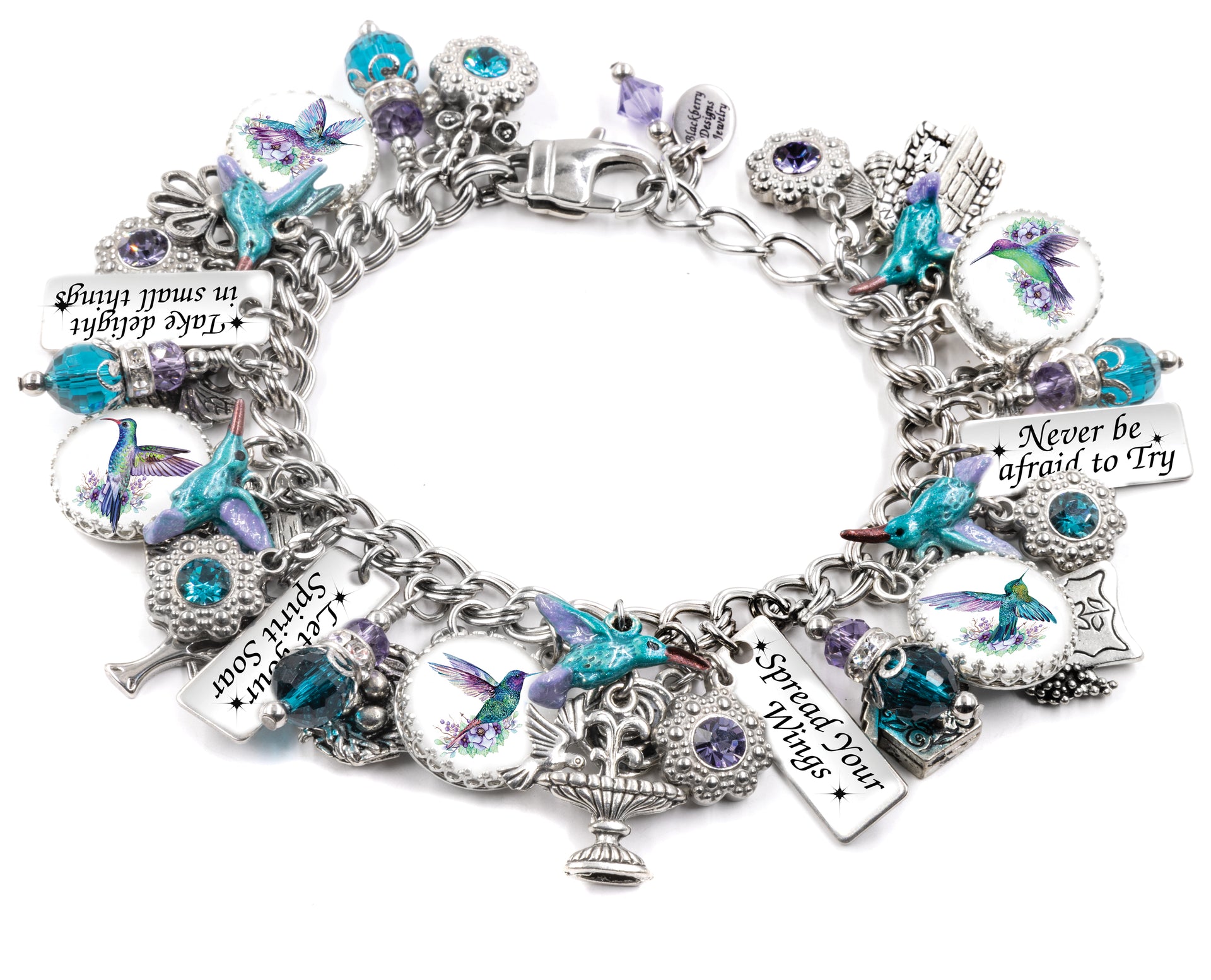 The beauty of Hummingbirds is that they move from flower to flower symbolizing beauty, spirit, spreading their wings in colorful harmony with nature. Our Hummingbird bracelet is a reminder to Never be Afraid to Try, and a Life well lived is worth everything. Handcrafted in stainless steel with that will never tarnish, with vivid color, whimsical details and eye catching designs.