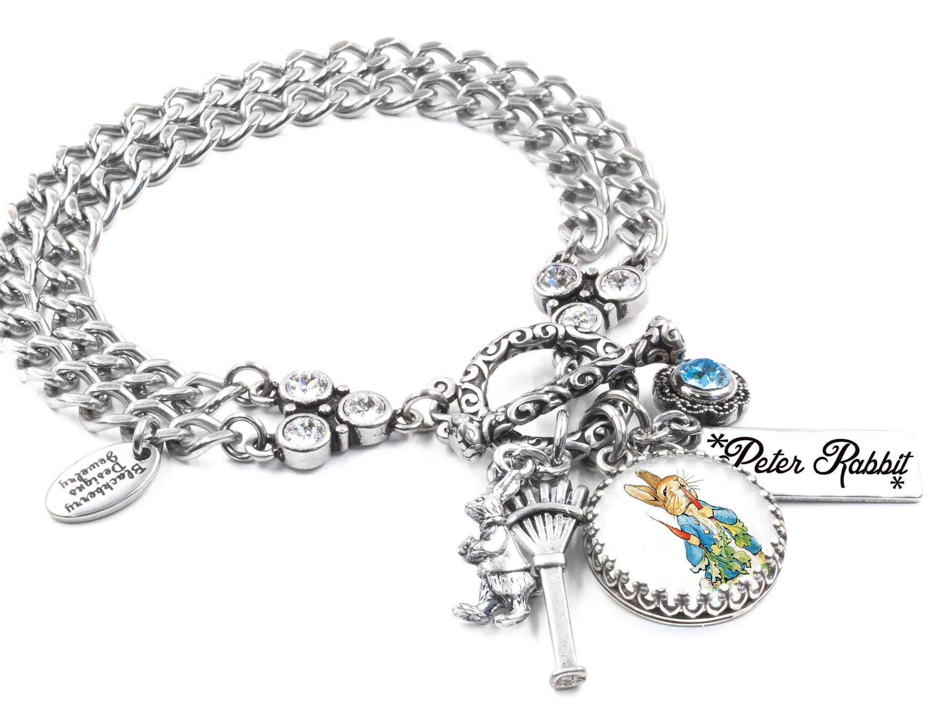 Join Peter Rabbit in Mr. McGregor's Garden with my Peter Rabbit Bracelet. Includes Engraved Charm, Aquamarine Austrian Crystal, charms of rake and Peter Rabbit, plus a vintage image of Peter Rabbit. Handcrafted Jewelry created to last a lifetime in non tarnish stainless steel.