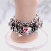 This amazing Pink Rose and Pearls Bracelet includes 12 silver rose charms, and twelve pink roses is a soft pink Rose Pattern created from images of a China Plate pattern c. 1950's. To preserve the plate, I scan the image, print and cure under a heart glass cab and then set into a sterling silver heart setting. This is not real broken china, but a reproduction of a vintage broken china pattern. Top this lovely piece off with fresh water pearls, Rose Sparkling crystals, and tons of heart charms and this lovely piece is sure to be a hit for any occasion. Handcrafted jewelry in timeless stainless steel.