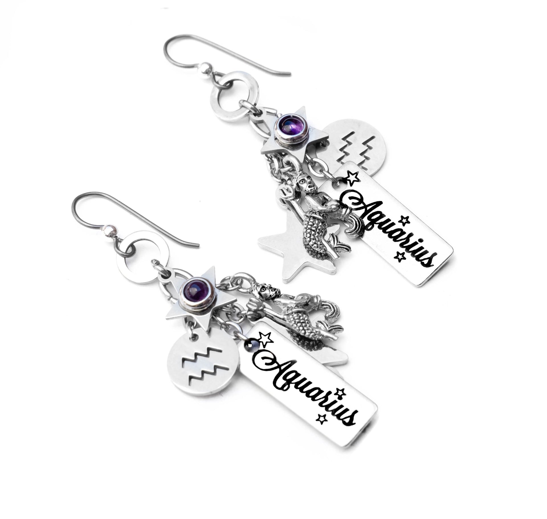 These beautiful Aquarius Horoscope Earrings are created your star sign, choice of gemstone, engraved charms, ram charm, and lots of magical stars. The drop on the earrings are 2" and handcrafted in solid stainless steel. Your earrings will never turn color and are non tarnishing. Artist created in America. Your memories last forever so should your jewelry.