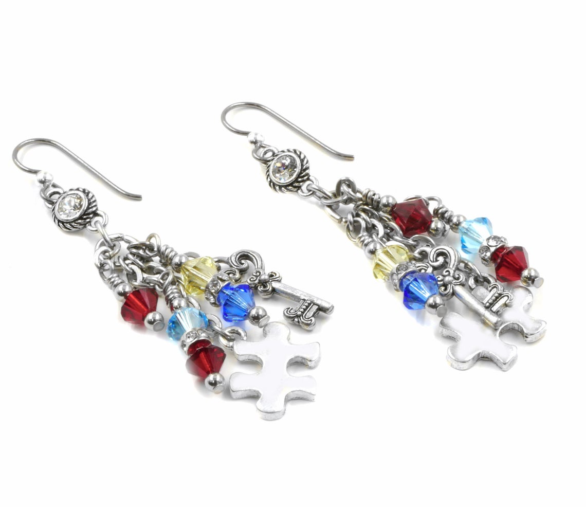 Honor those you love that have Autism with these beautiful crystal dangle earrings with sapphire, red, aquamarine, and champagne yellow colorful crystals. These earrings are 1 1/2" long and include keys and puzzle pieces. The drop charms earrings have been mirrored to look lovely when wearing and can be created with ear wires or spring back hoops for non pierced ears.