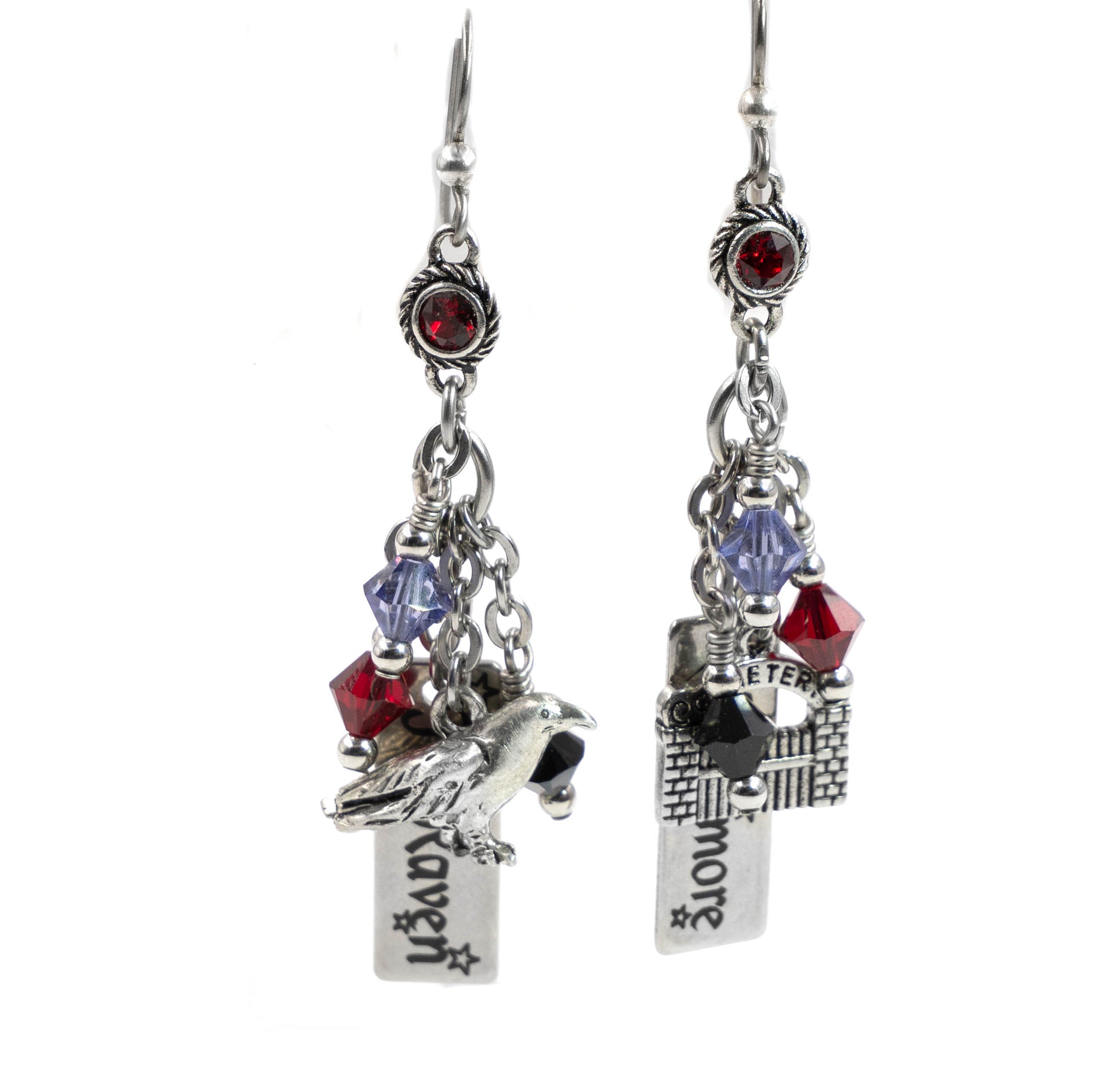 Explore your Gothic side in our Edgar Allen Poe Mismatched earrings. From Nevermore to The Raven, Colorful Crystals, and engraved charms these earrings will become your favorite all year round. Artist crafted jewelry in Timeless Stainless Steel.