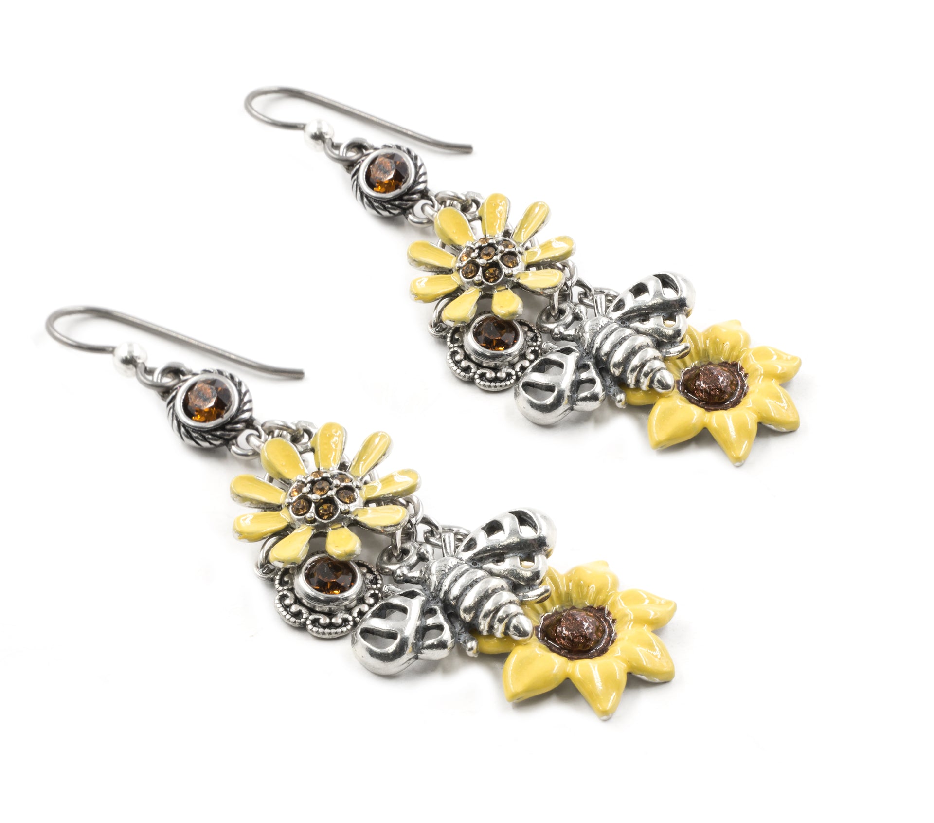 Keep your face to the sun with our Sunflower Earrings, and you'll be smiling all day. Perfect for a bit of whimsy with any outfit. Surrounded with hand enameled Sunflowers set with Chocolate Sparkling Crystals.  Artist crafted jewelry Made in America and created Timeless Stainless Steel. How its made matters.