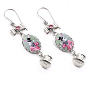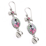 Each handcrafted piece is set in silver and framed by dainty bows and shimmering pink crystals for an extra dose of sweetness. Tiny silver teacups dangle below, catching the light and adding a sense of movement and joy to every wear.