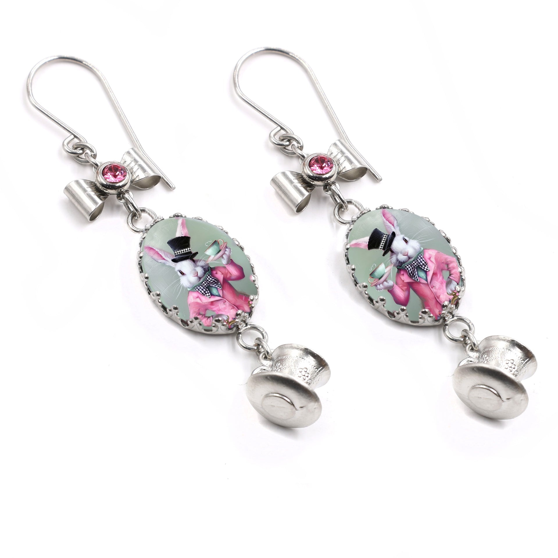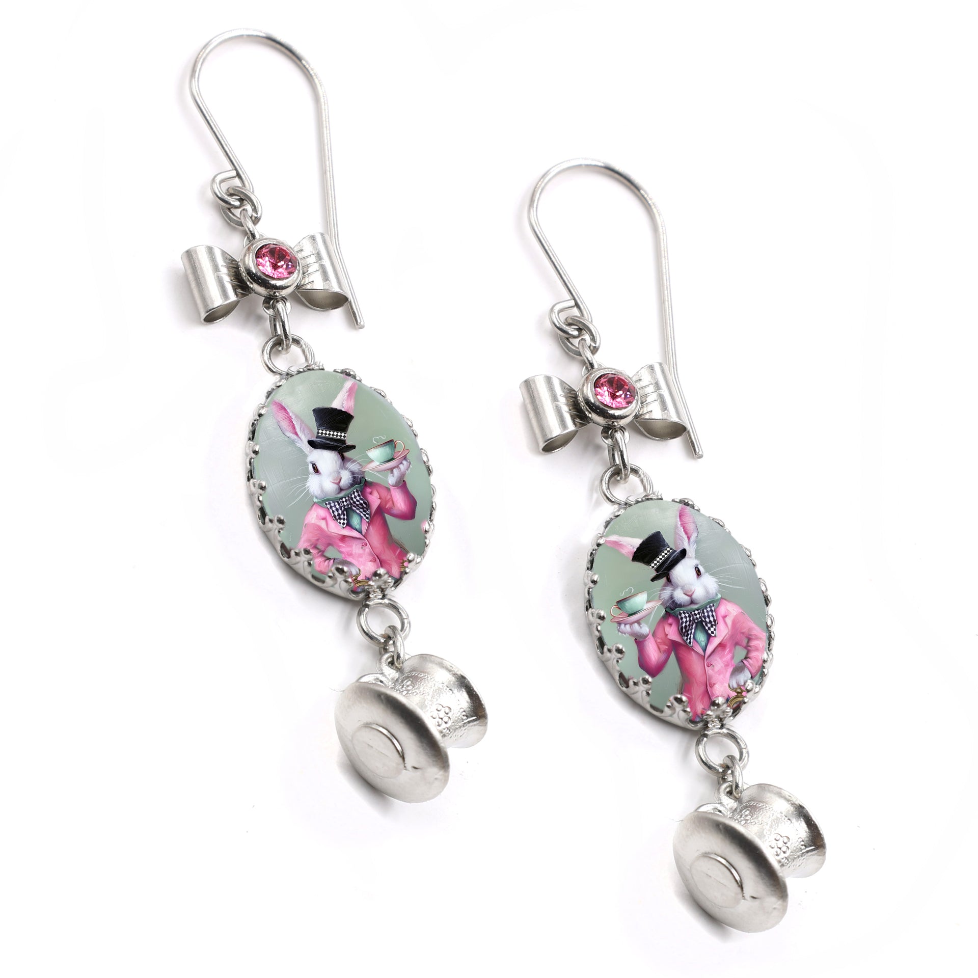Add a little sparkle and storytelling to your day with our Tea Party Bunny Earrings—a delightful pair inspired by enchanted gardens and fairytale dreams. Featuring a dashing white rabbit in a rosy pink suit, complete with a teacup and top hat, these earrings bring timeless charm with a playful twist.