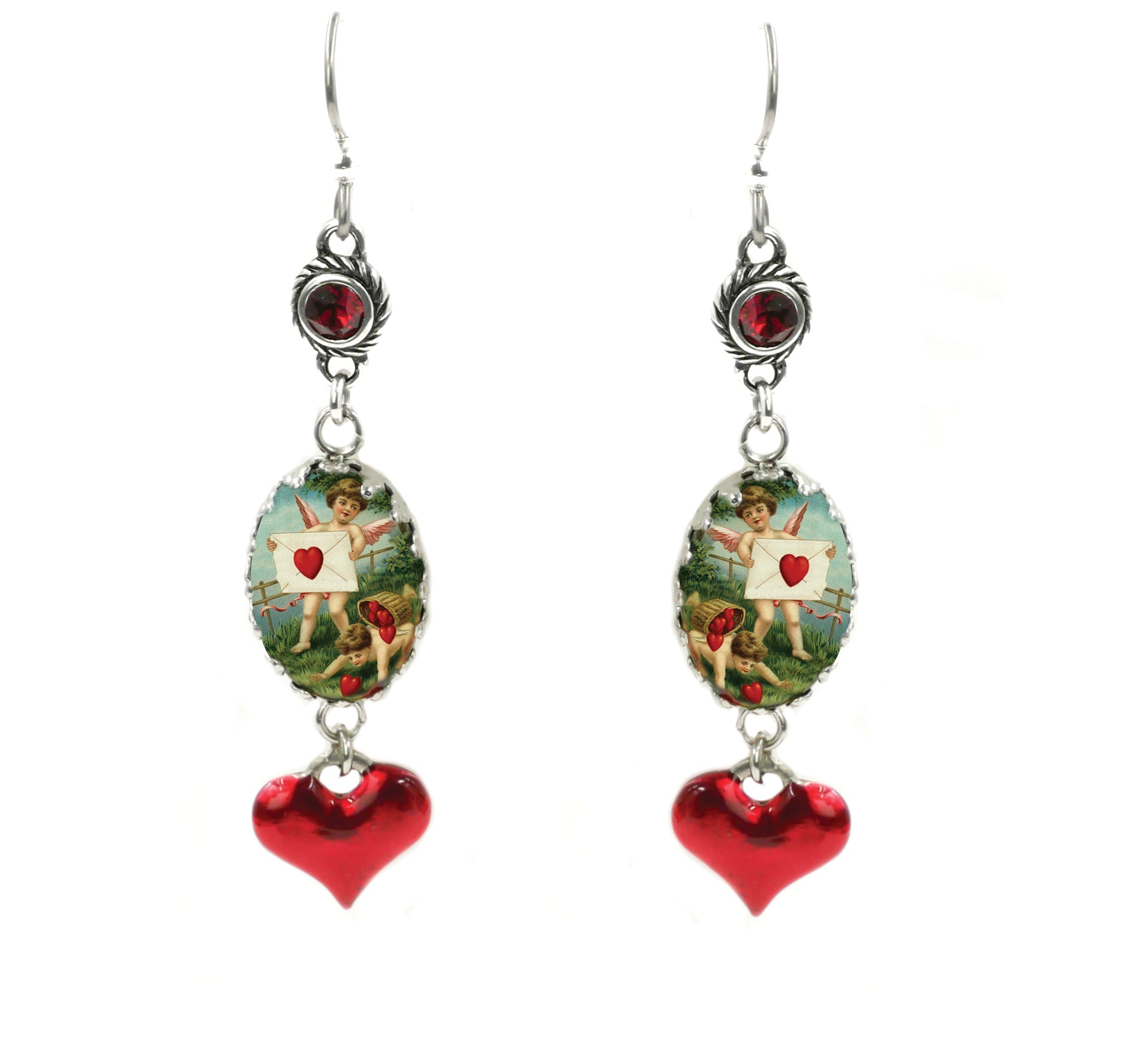 What's more romantic than a vintage valentine. Add some hearts and you have an amazing pair of earrings she'll fall in love with. Created with vintage valentines from the early 1900's. These earrings are incredibly light weight and can be worn comfortably all day long. Comes in french hooks for pierced ears or clip on hoops for non pierced ears.