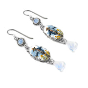 The pendant image on these earrings shows cute scarecrows sitting atop pumpkins in front of a red farmhouse. The pendant is set in silver filigree with a pop of sparkle from sapphire crystals and teardrop light sapphire crystals.