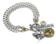 This Cheshire Cat charm bracelet is inspired by Alice in Wonderland, a symbol of fun and features a vintage image from the early 1900's surrounded by a sterling silver crown setting, colorful crystals, and silver Cheshire cat and sitting tree. It also includes a laser engraved charm with the phrase "Cheshire Cat " and is handcrafted in America from stainless steel and sterling silver, ensuring it will never tarnish or change color. Custom sizing is available, and the bracelet comes with a lifetime warranty for added assurance.