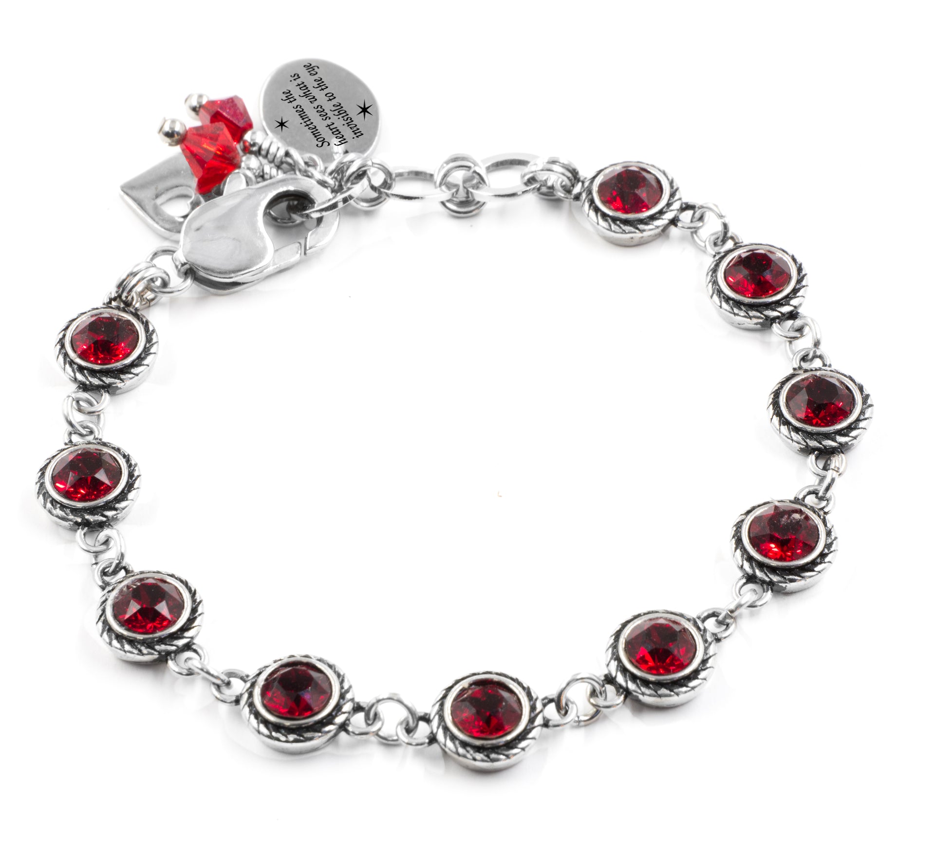 Sometimes the heart sees what is invisible to the eye, with our Ruby Crystal Link Bracelet. Handcrafted art jewelry in beautiful and durable no tarnish Stainless Steel, curved links for comfort, won't snag clothing, adjustable for the perfect fit. Artist Crafted Jewelry, because how it's made, matters. You're one of a kind, this is your jewelry.