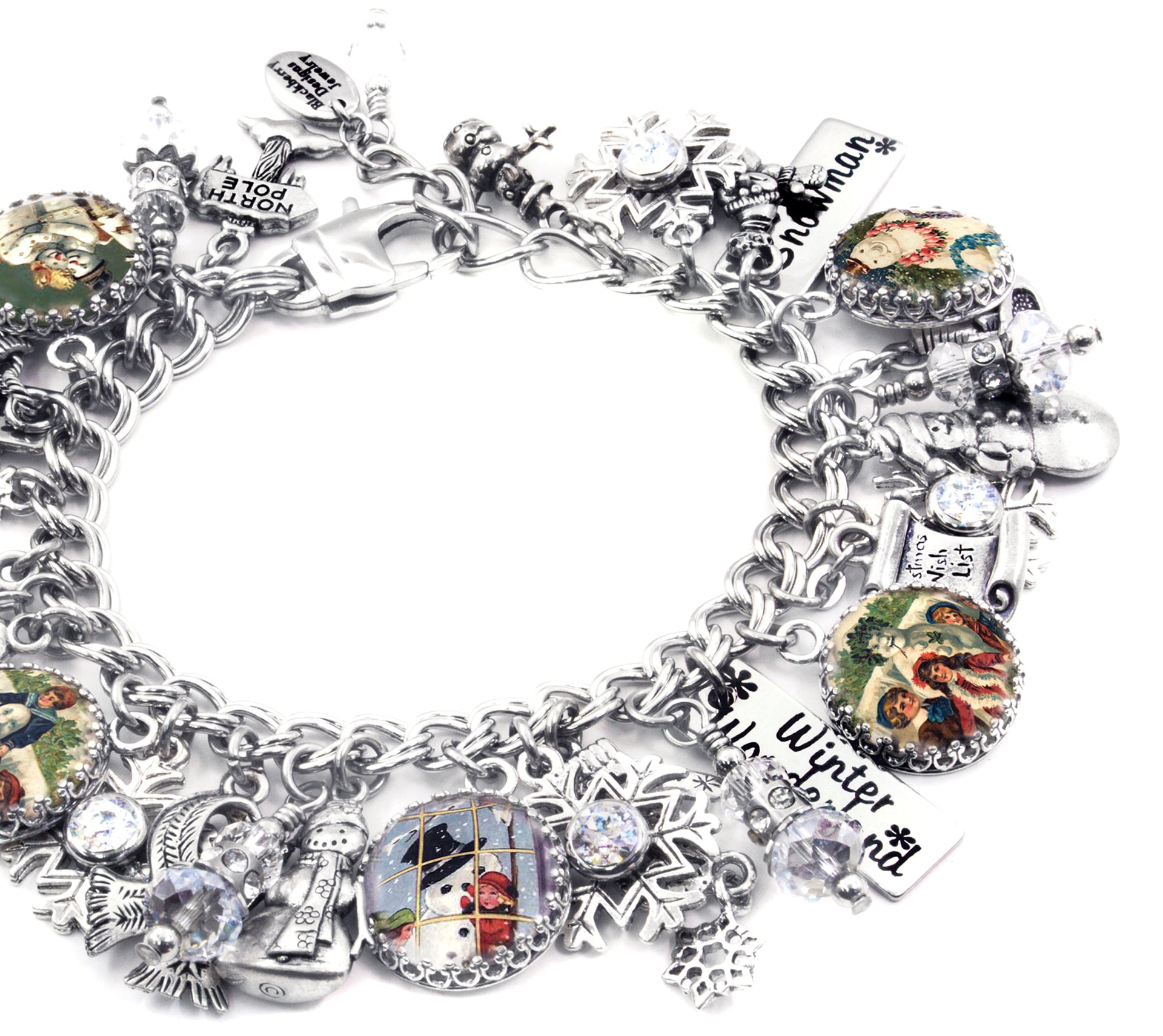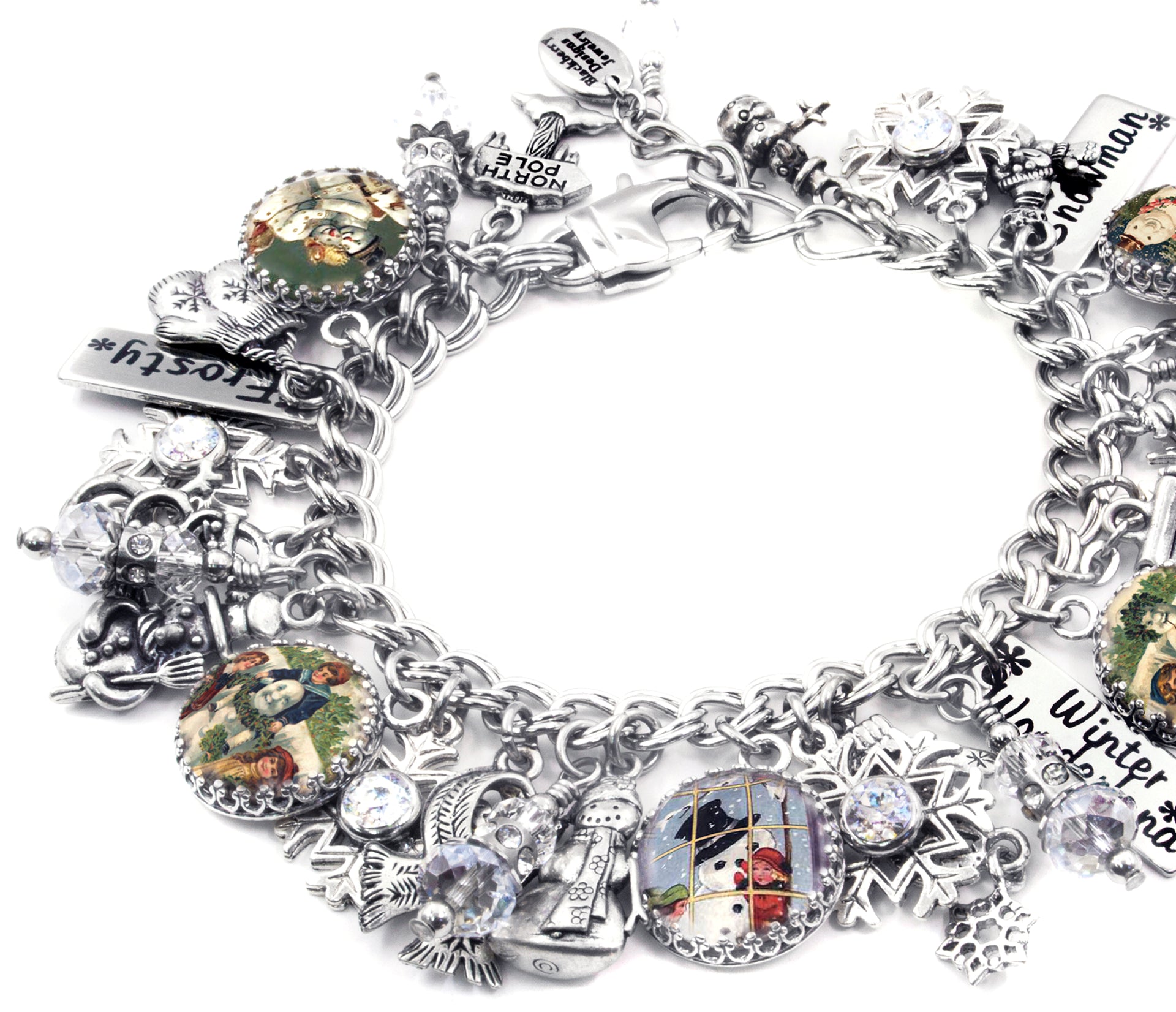 With his corncob pipe and button nose Frosty the Snowman Charm Bracelet is sure to put a twinkle in your eye. These fun vintage images from the early 1900's, engraved charms, and over 34 silver charms with Colorful Sparkling Crystals in Moonlight will make this bracelet a winter go to favorite.  Masterfully Crafted, Magically Charming, One of a Kind Jewelry because our artists believe, how it's made matters.
