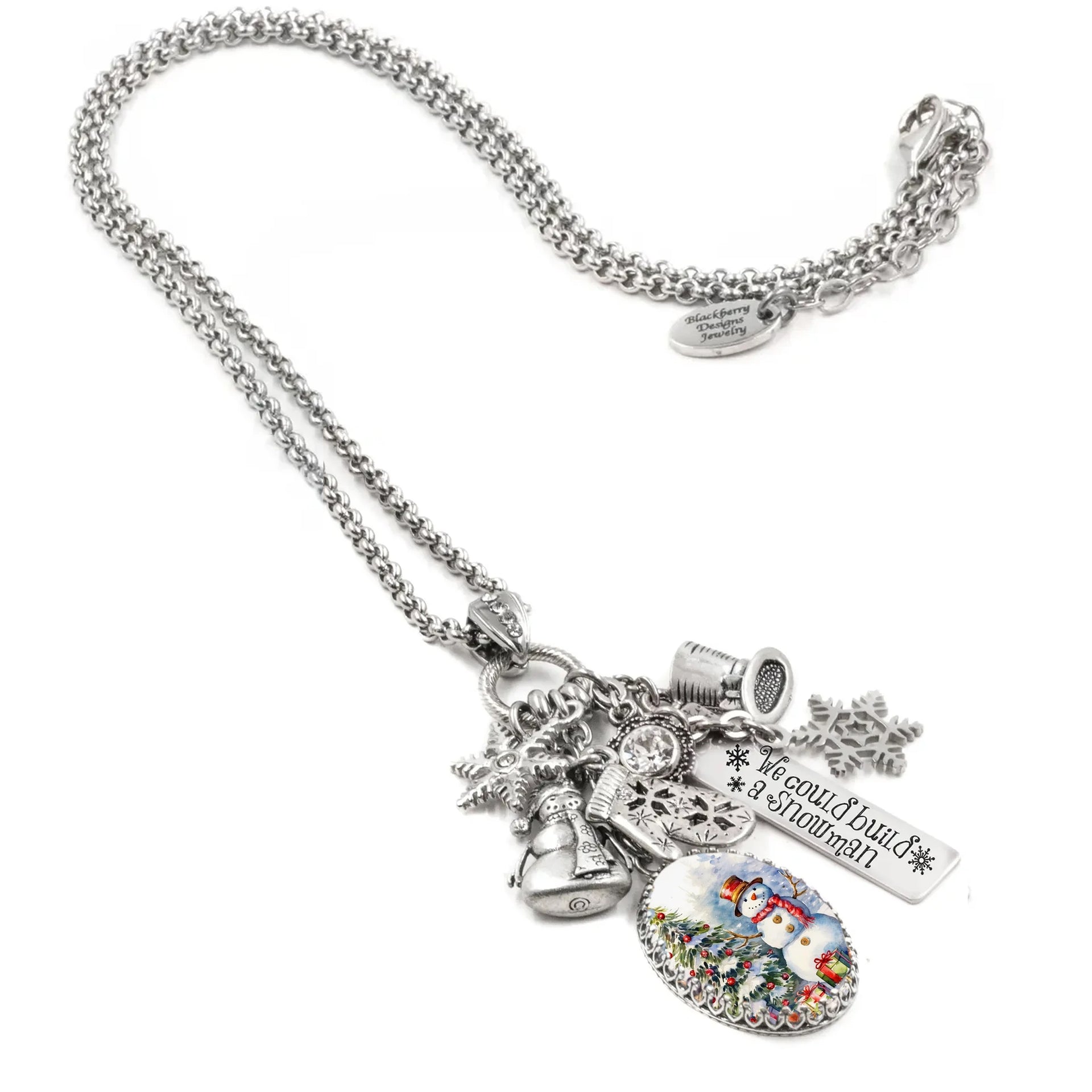 We could build a snowman with this fun Frosty the Snowman charm necklace. Vintage image from a 1920's postcard of a snowman with tophat and children looking through the window. Artist created in our California Studio of Timeless Stainless Steel. How it's made matters and quality is always remembered.