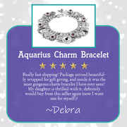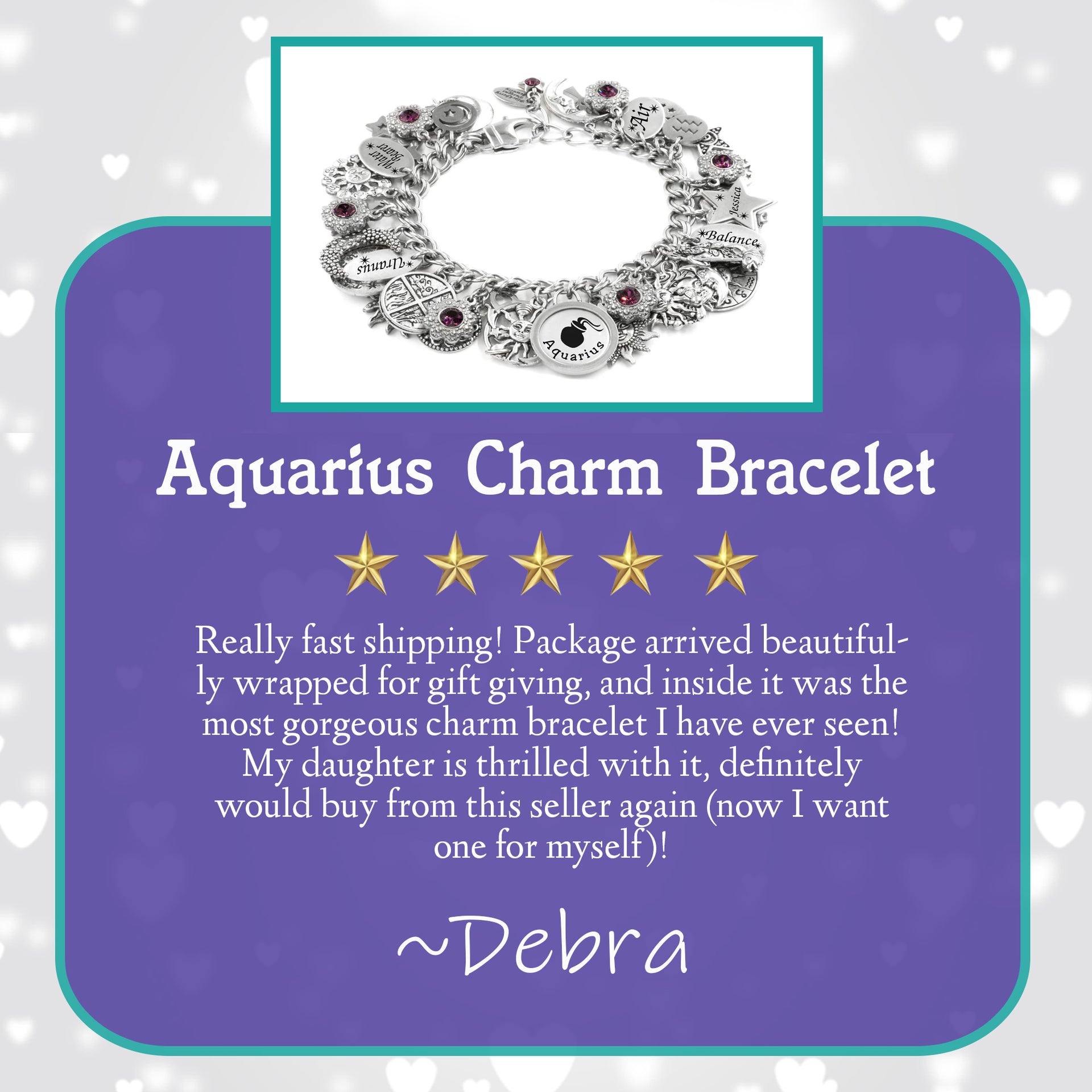 Express your Aquarius Sign with unique Aquarius astrological jewelry for the February Birthdays plus January Birthday Gifts! You're a Aquarius Horoscope Girl so are advanced, self-reliant, clever, exceptional, and optimistic. Air is your Aquarius elemental sign. Express your Aquarius Horoscope traits with this amazing Aquarius Zodiac Charm Bracelet. Featuring 16 silver zodiac and horoscope themed charms. Twinkling stars, element sign of earth fire water air, Aquarius horoscope charms, planet, 12 sun signs, and crescent moons. Top that off with a fun Aquarius the water bearer and Engrave charms of Air, Water Bearer, Uranus, Balance. This Aquarius zodiac charm bracelet is the perfect gift for the lover of all things mystical and can even include your choice of birthstone.