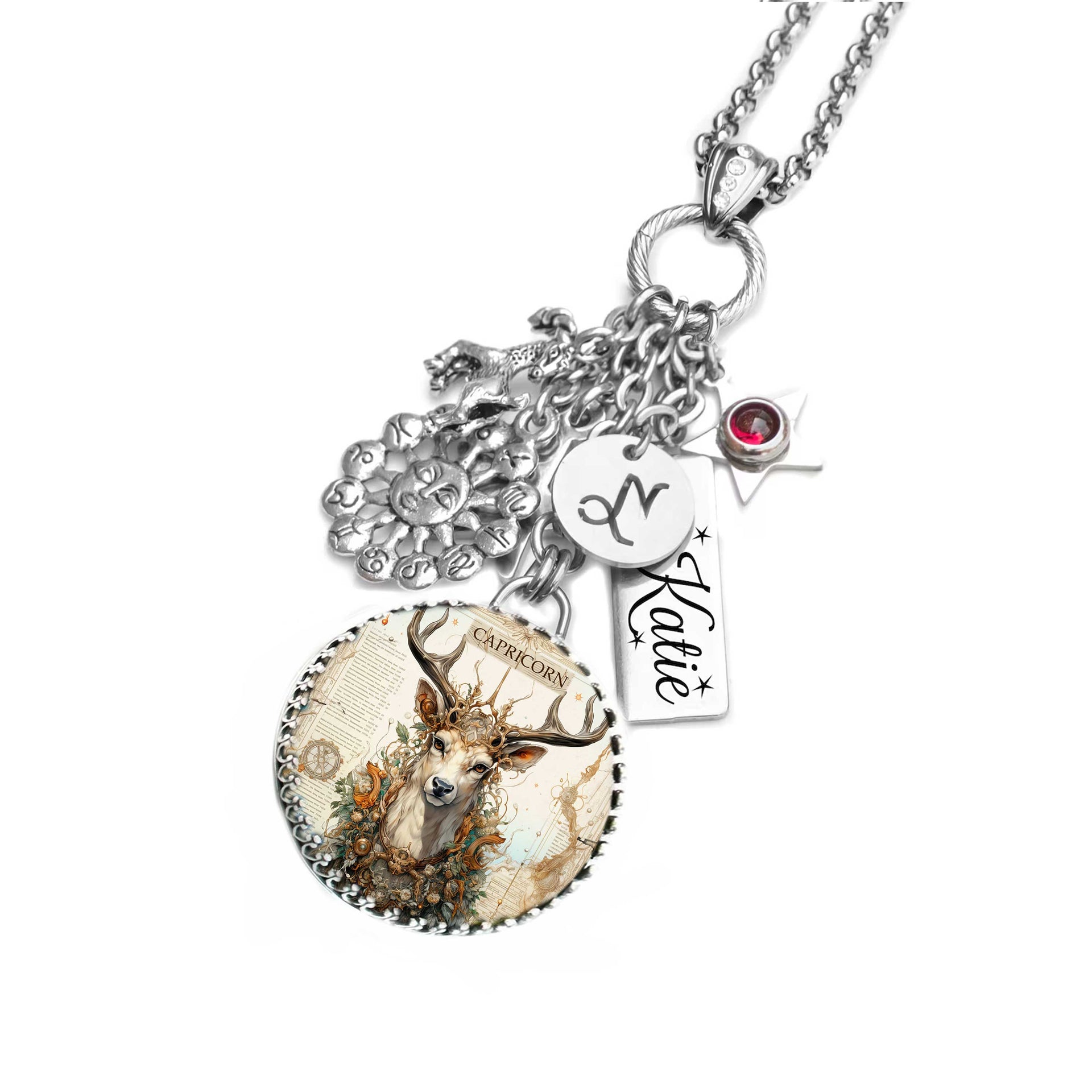 Unique with an engraved personalized charm with name, Capricorn Pendant, Capricorn horoscope sign, Capricorn Goat Charm, 12 zodiac charm, top that off with your choice of authentic gemstones set in stars.