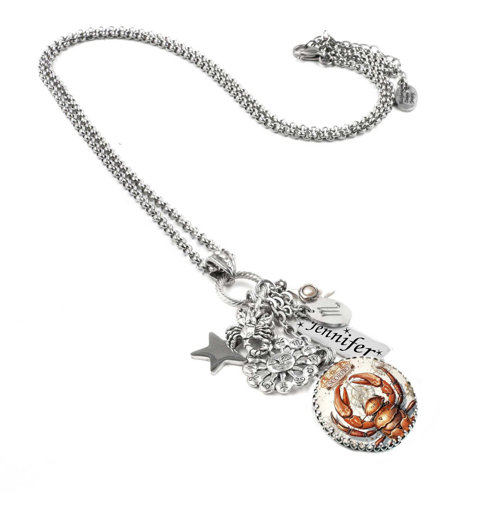 Unique with an engraved personalized charm with name, Scorpio Pendant, Scorpio horoscope sign, Scorpion scorpion charm, 12 zodiac charm around the sun, top that off with your choice of authentic gemstones set in stars.