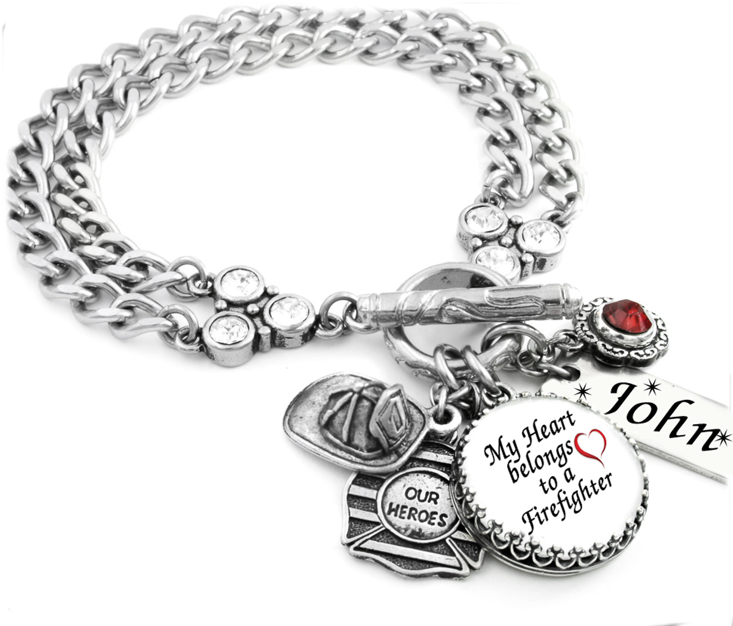 This beautiful Firefighter charm bracelet can be personalized with a name of your favorite Firefighter and Sparkling crystal color. Great for a Mom, Grandma, Wife, Sister, Daughter, or that special someone. Includes a engraved charm with name. Handcrafted in non tarnish stainless steel.