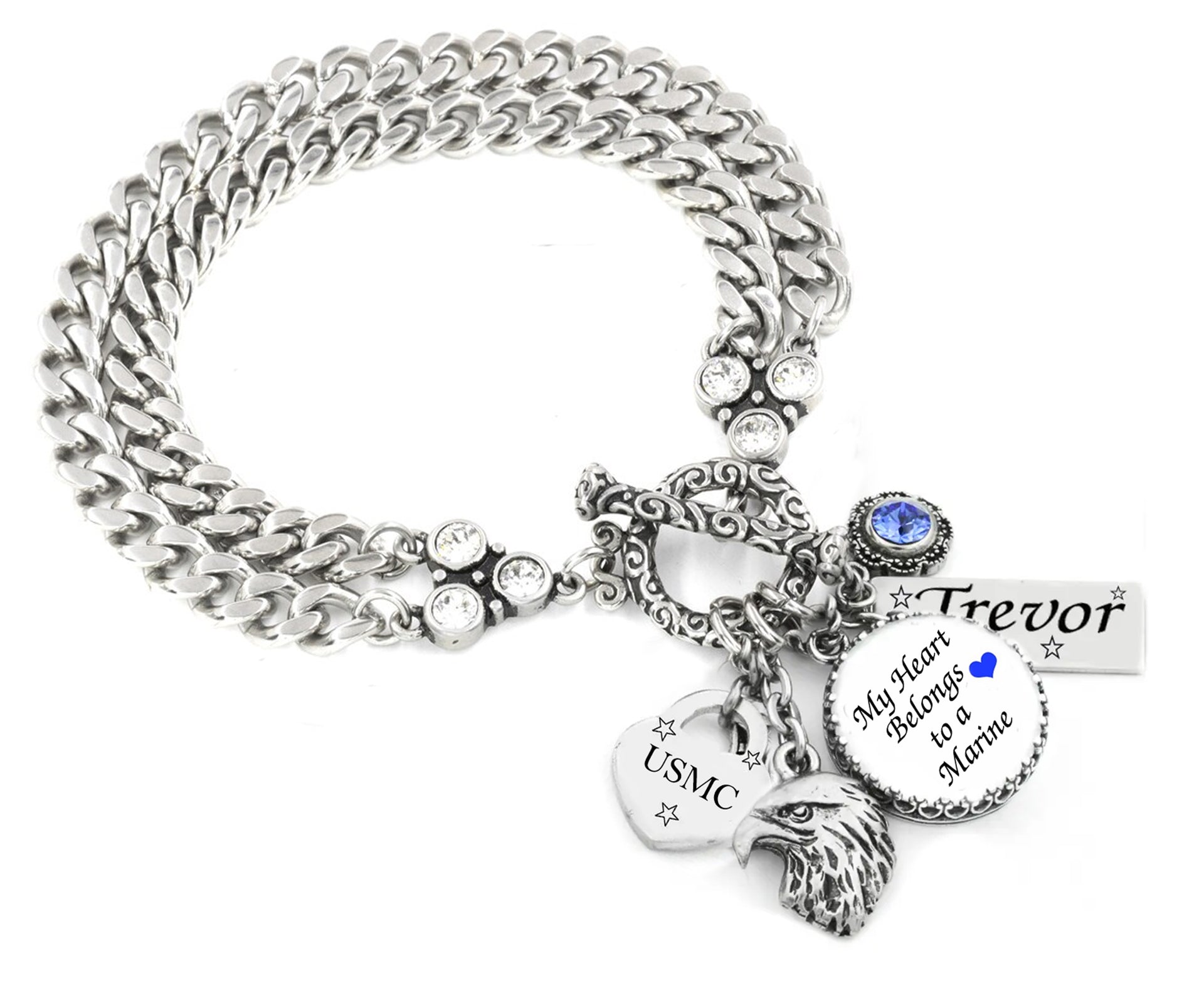 Personalized this My Heart Belongs to Military Bracelet for a Mom, Grandma, Wife, Sister, Daughter, or that special someone. Includes a heart charm engraved with Military Branch, engraved charm with Serviceman's or Servicewoman's name, charm of Military branch, and Sparkling® crystal charm in your color choice. Personalized with your choice of military service. Handcrafted in non tarnish stainless steel.