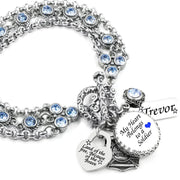 Treat a special military mom, grandma, wife, sister, daughter, or loved one to a personalized your bracelet to honor your Soldier. This stunning piece features a heart charm engraved with the United States Army (US Army) military branch symbol, as well as a charm engraved with the service person's name. The bracelet also includes an Austrian crystals in sparkling Sapphire. Also a charm representing the military branch. You can choose the military service of your choice to make the bracelet truly one-of-a-kind. Handcrafted from durable, non-tarnish stainless steel, this bracelet is sure to shine for years to come.