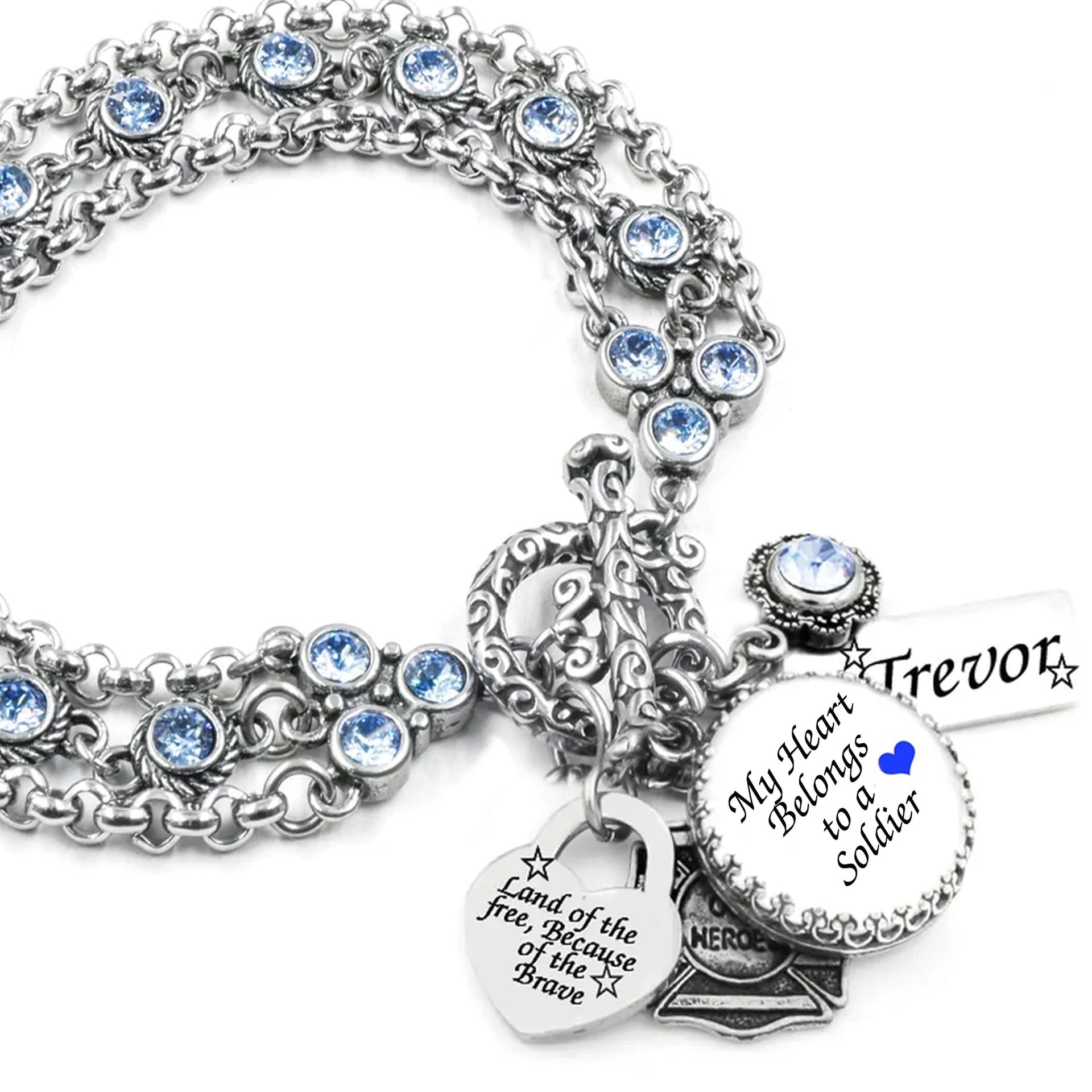 My Heart Belongs to a Soldier in Sapphire Crystals, to honor your Service man or Service woman in the US Military. Personalized this Military Bracelet for a Mom, Grandma, Wife, Sister, Daughter, or that special someone. Includes a heart charm engraved with US Army or Military Branch, for your Soldier. Engraved charm with Service man's or Service woman's name, charm of Military branch, and Austrian crystal charm in your color choice. Personalized with your choice of military service. Handcrafted in non tarnish stainless steel.