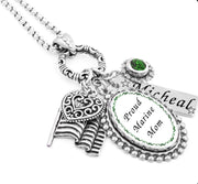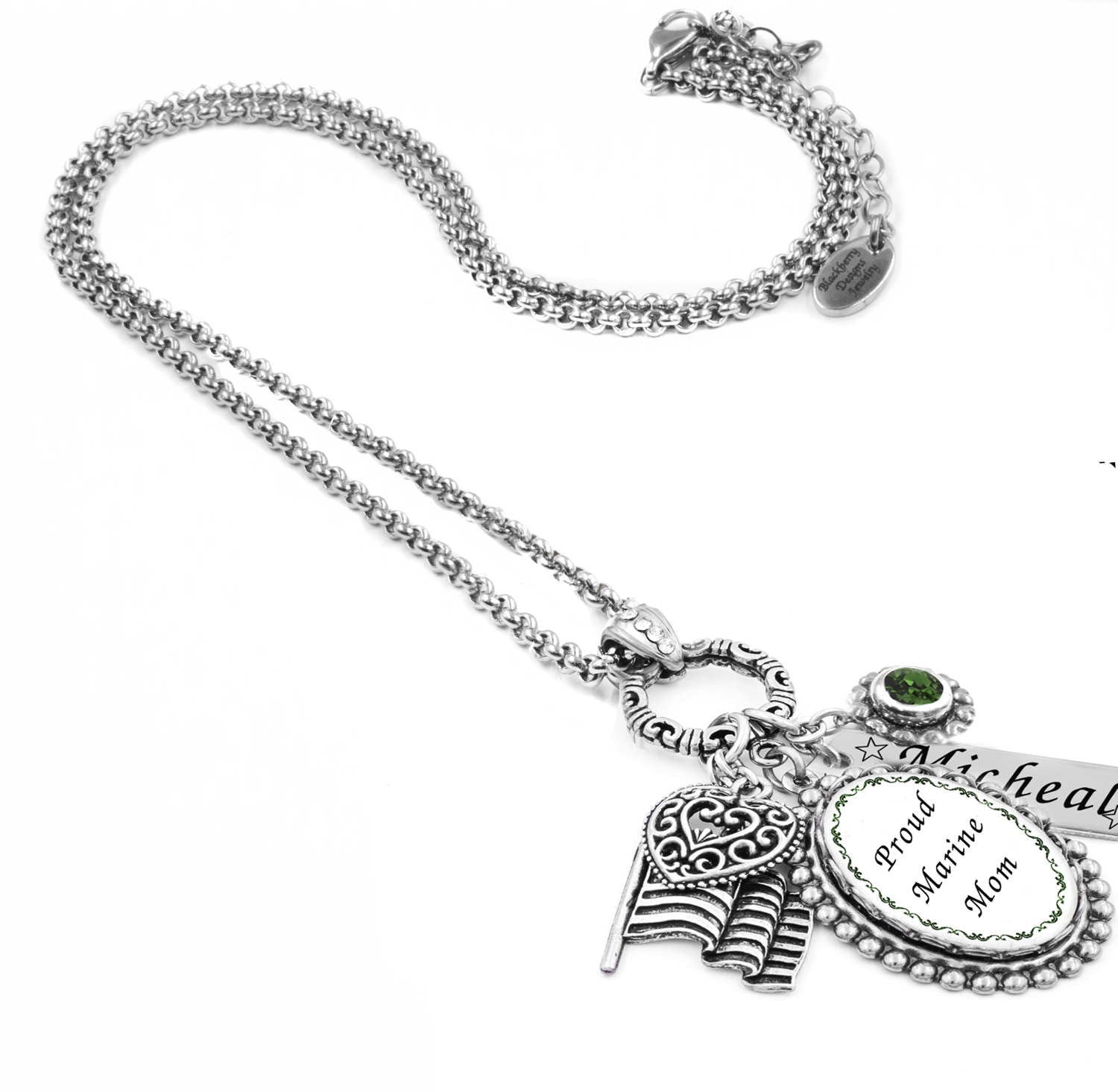 A beautiful Marine Mom military necklace to honor your loved ones in the service. This necklace will be personalized with Marine Mom, Marine Wife, Marine Grandma, or any name you would like, includes your choice of 12 birthstone colors, 2 charms as shown, personalized engraved Marines name and the Sparkling® crystal birthstone, all in Stainless Steel.