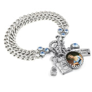 You'll love Jane Austen for her classic stories. If you're a fan this is the perfect bracelet celebrate all things love of the writer. A mid century style bracelet with light sapphire crystals charms of book and inkwell and engraved charm.