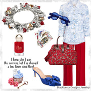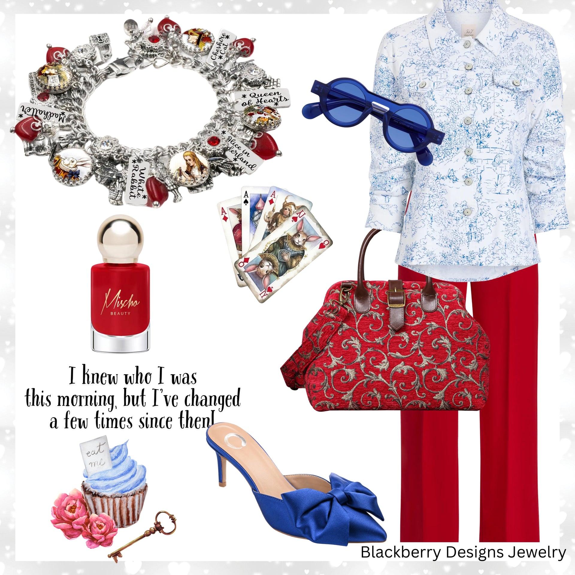 Join Alice and her friends for a whimsical journey with our series of Alice in Wonderland charm bracelets. With vintage images of Alice the White Rabbit, Queen of Hearts, Mad Hatter and Painting the Roses Red Cards brings these fantastic characters to life. You'll find Alice in Wonderland with her "drink me' bottle, the White Rabbit in his court suit, the Queen of Hearts with her specter, and the Mad Hatter at his tea party with the cards painting their roses red. This artist created one of a kind bracelet will add a fanciful and colorful touch to your fashion, and like the child in all of us our Alice in Wonderland Charm Bracelet will delight for many years to come.