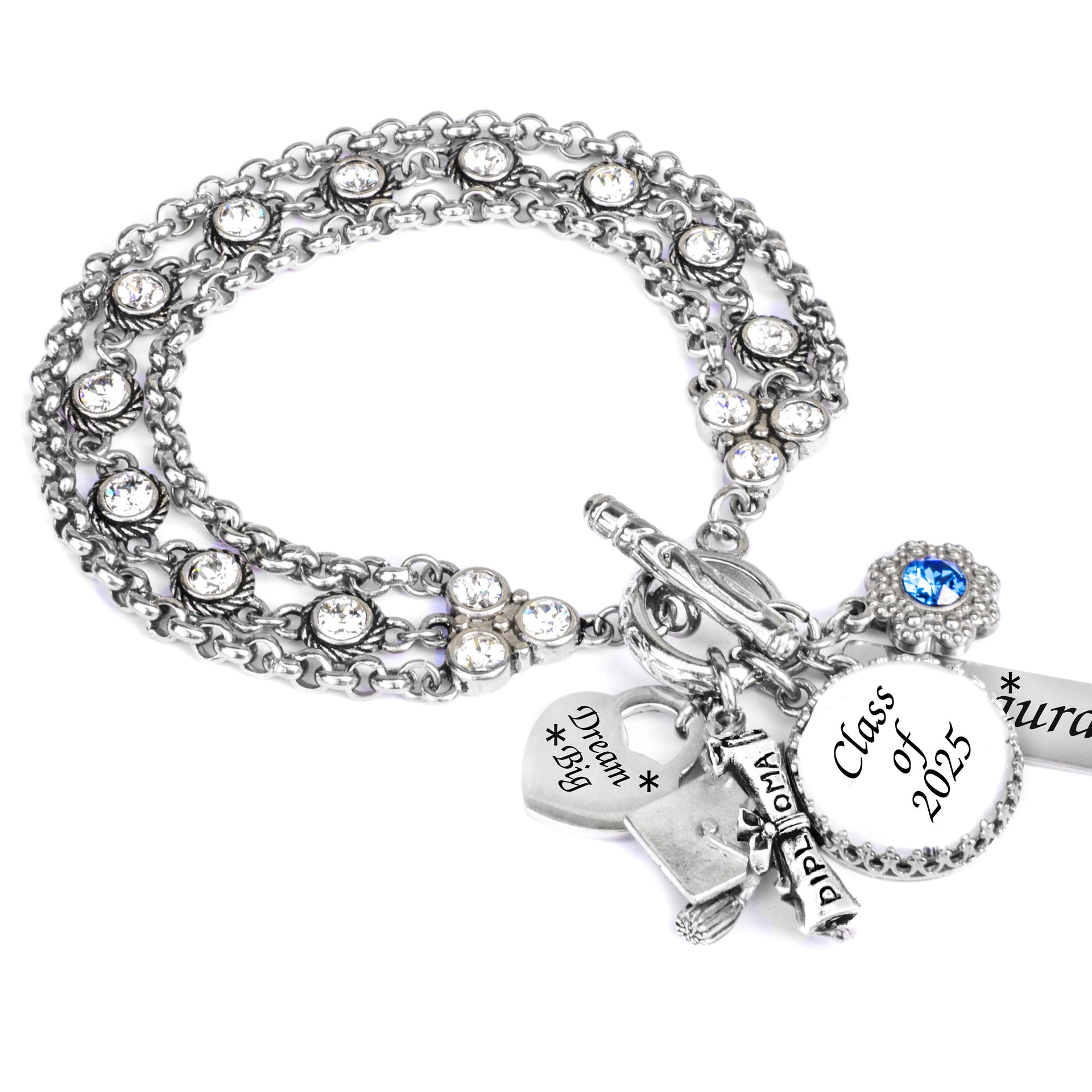 Personalize her crystal graduation bracelet with her name, graduation class year engraved on a sterling silver charm, and Colorful crystals of her birthstone or favorite color. Graduation jewelry also includes a silver graduation cap charm, a diploma charm, and an engraved stainless steel heart with a heartfelt message reminding her to âDream Bigâ!