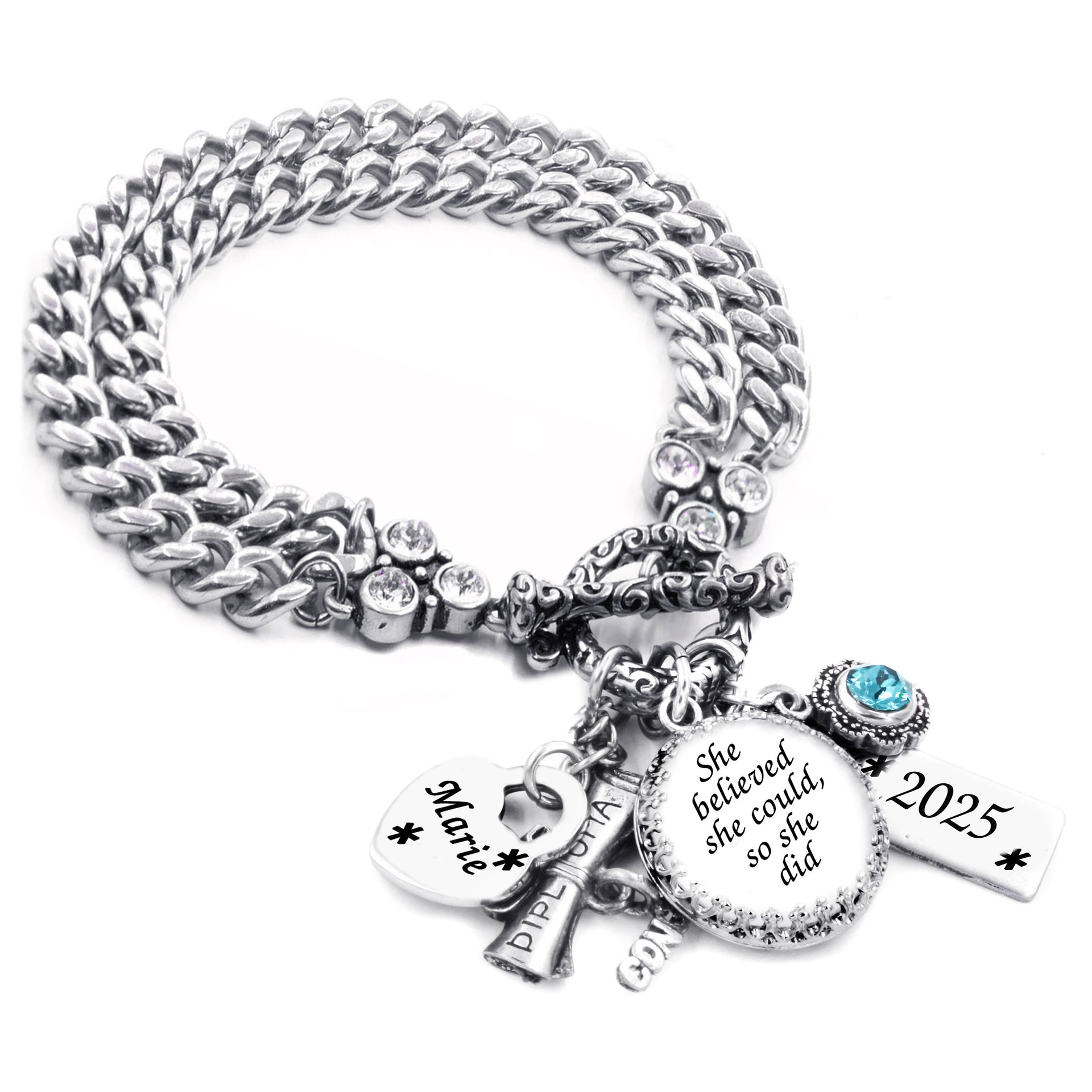 Make their graduation day extra special with this stunning Graduation Quote Bracelet. The bracelet features handcrafted in Never Tarnish Silver™, a sparkling crystal of your choice, and an easy-to-use toggle clasp. The Graduation Charm Bracelet also includes an engraved rectangle charm with the year of graduation, an engraved heart charm with the graduate's name, a round charm with the inspiring quote "She believed she could, so she did," Plus a diploma charm all rounds out the Graduation Gift. This Graduation Bracelet makes the perfect gift for a college, high school, or nursing school student who is graduating in 2024, of course we always customize the graduation date for you. It comes gift boxed and wrapped, ready to surprise and delight the special graduate in your life. Find more graduation jewelry to commemorate this momentous occasion.