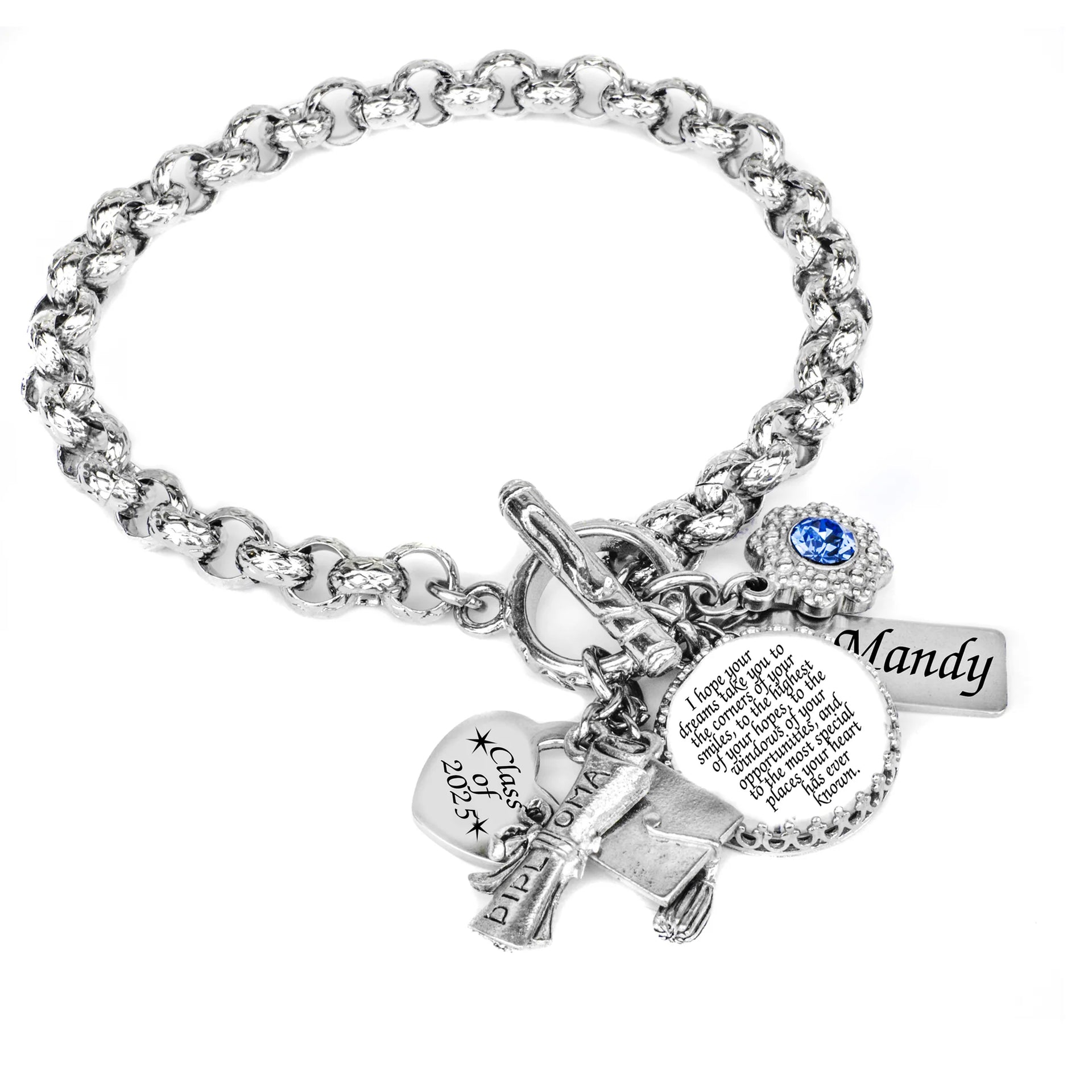 Personalize her crystal graduation bracelet with her name, graduation class year engraved on a sterling silver charm, and Colorful crystals of her birthstone or favorite color. Graduation jewelry also includes a silver graduation cap charm, a diploma charm, and an engraved stainless steel heart with a heartfelt message reminding her to “Dream Big”!
