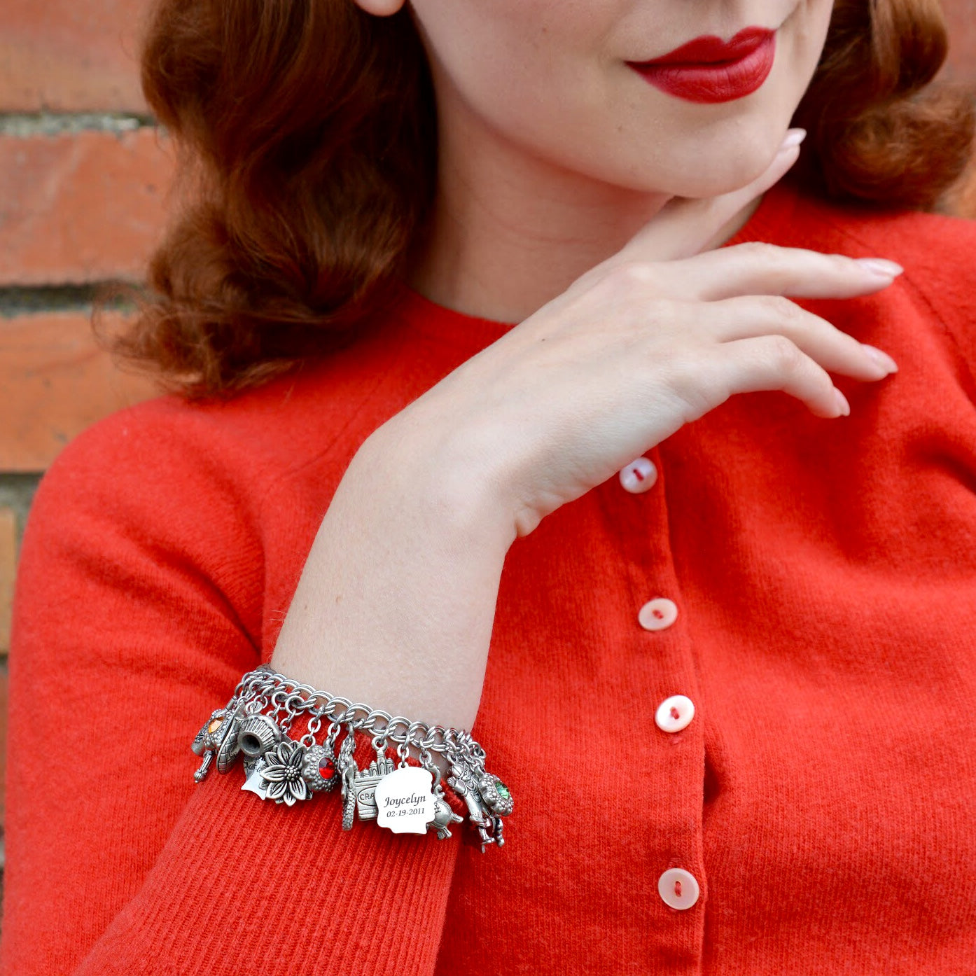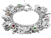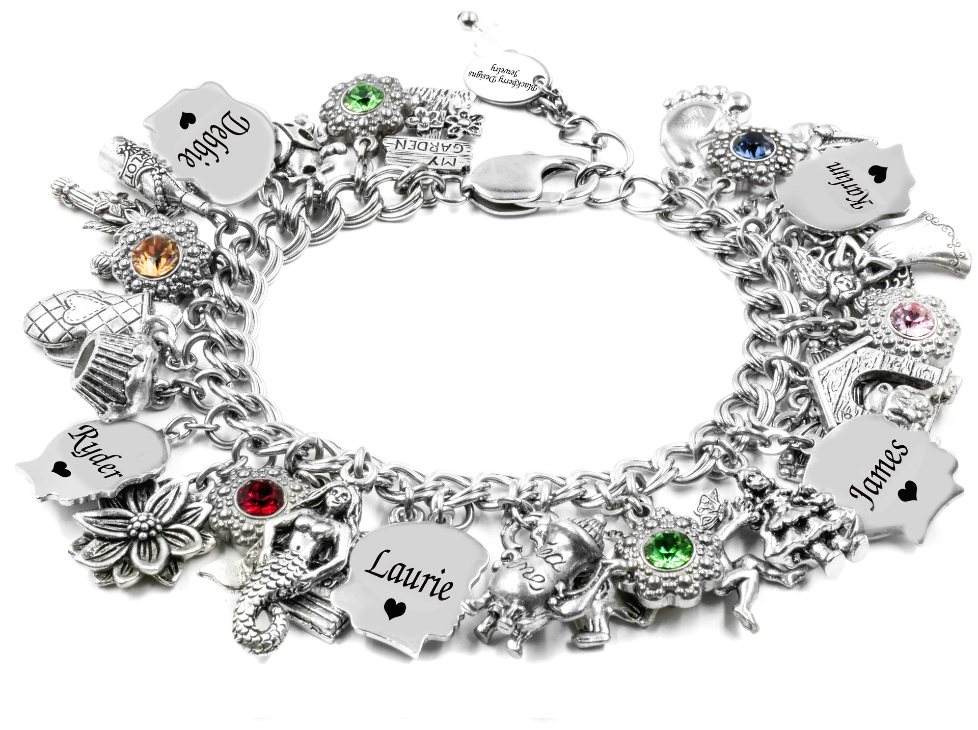 What a great Family Bracelet with a Silhouette of each child and engraved with their name and birthstone. The child's faces are from a vintage charm bracelet from the early 1950's that I had reproduced in stainless steel. Choose your own 14 charms from our charm catalog. Guaranteed to never turn color. Artist created jewelry in Timeless Stainless Steel for daily wear.