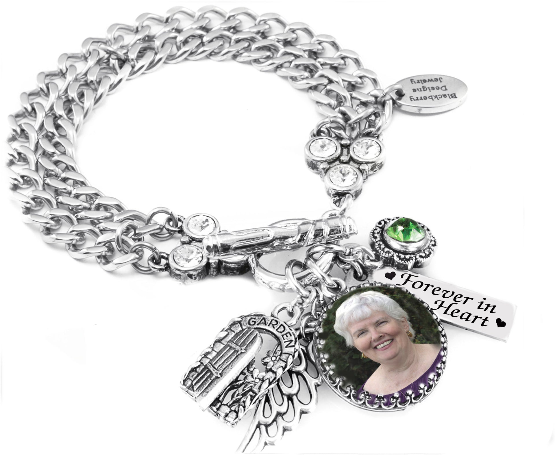 Create a sentimental memorial photo bracelet that she will cherish for a lifetime. Perfect for a remembrance gift with custom engraved bracelet, personalized birthstone, and choice of charms. Please be sure to include only a high quality photo that is uncropped, this memorial photo bracelet allows photoshop work on your original photo only, any additional photos are extra. Handcrafted Jewelry created to last in stainless steel and sterling silver. Artisan Jewelry created in America to last with a Lifetime Warranty.