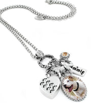 Honor a loved pet that has passed with this dog memorial necklace. Personalized with your choice of engraved charms with pets name, Austrian Crystals, silver dog charms and your own photo. Please be sure to include only a high quality photo of your dog or pet that is uncropped, this custom pet memorial photo necklace allows photoshop work on your original photo only, any additional photos are extra. Size Inclusive Jewelry Petite to Plus Size Jewelry in Non Tarnish Silver. Authentic Artisan Jewelry Masterfully Crafted in Timeless Stainless Steel.