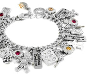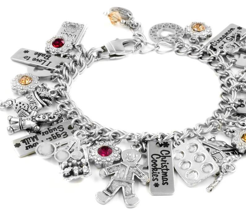 Christmas Cookies ladies and child's winter charm bracelet is handcrafted by our artists in the USA of non tarnish stainless steel.  Loaded with muffin tins, cookie jars, gingerbread men, oven mitt and lots of lovely charms. These beautiful bracelets look great by themselves or as a layering piece, heirloom quality created to last a lifetime.