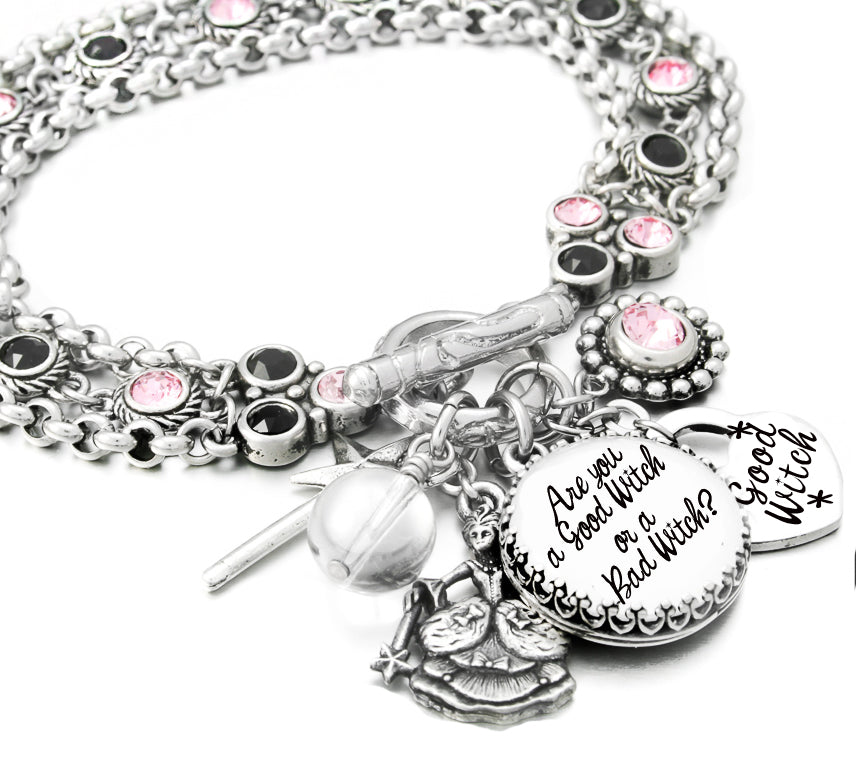 Find out if you are a Good Witch or a Bad Witch with our Wizard of OZ charm bracelet. Sparkling crystals, sterling silver quote charm, crystal ball, magic wand charm, and good witch charm. Handcrafted in Timeless Stainless Steel with Endless Possibilities.