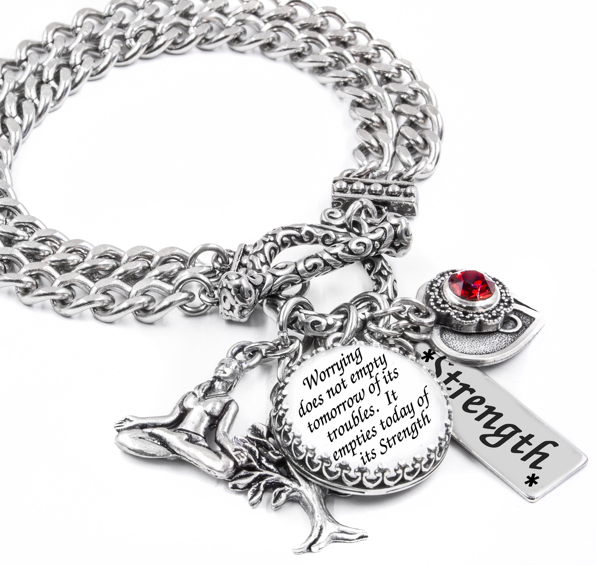 Your beautiful stainless steel bracelet with inspirational quote will remind you everyday that worrying only empties today of it's strength. Handcrafted with a Sparkling® crystal, charms of balance a tree of life, meditation girl and the yin yang symbol.