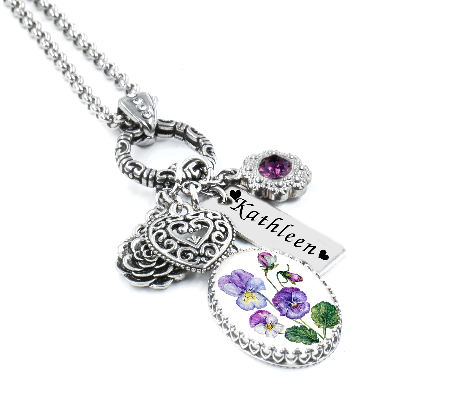 Flowers were used during the conservative Victorian era, where rules of etiquette were observed. Amethyst the February Birthstone and Violets the February Birthday Flower makes the perfect gift for the February Babies. A hidden romantic meaning was attributed to specific flowers. This birthday flower necklace is carefully handcrafted with your choice of flower image from the birth flower chart, a personalized engraved charm, and birthstone. These beautiful and personalized touches make this the perfect birthday gift for mom, sister, grandma, daughter, and loved one.