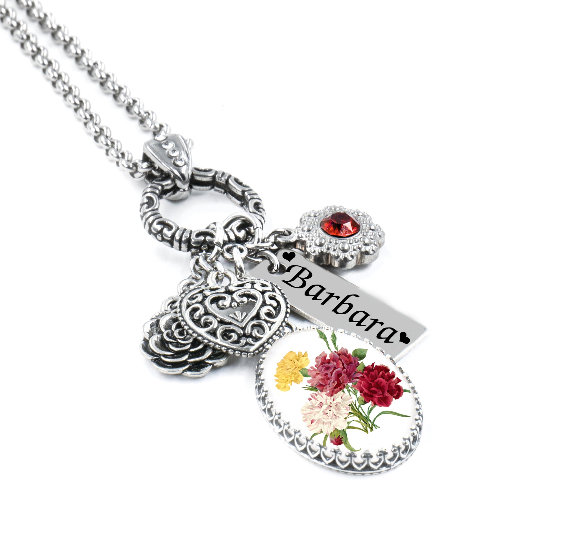 The Language of Flowers is telling a tale in our Personalized Flower Necklace. Flowers were used during the conservative Victorian era, where rules of etiquette were observed. A hidden romantic meaning was attributed to specific flowers. The January Carnation was fascination or devoted love. Handcrafted with your choice of flowers from chart, personalized engraved charm, and birthstone make this the perfect birthday gift for mom, sister, grandma and loved one. Created in Timeless Stainless Steel with a Lifetime Warranty.