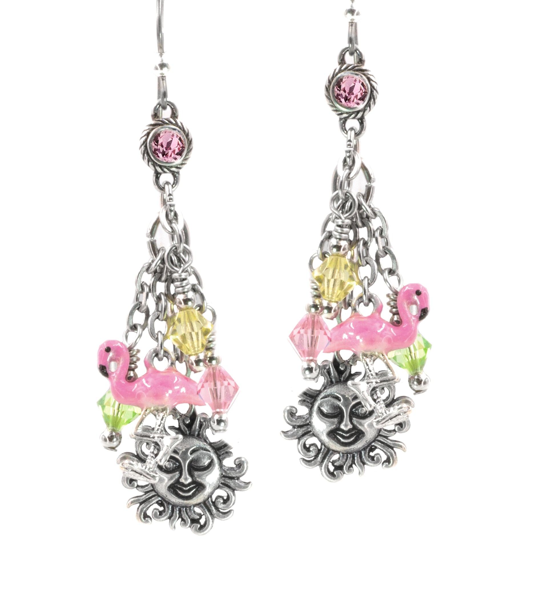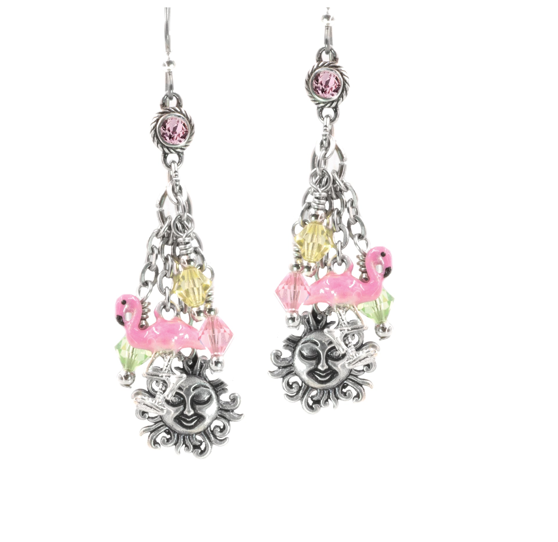 Surround your ears with sparkling pink, yellow and peridot, crystals, hand painted Flamingo Charms enameled in cute pink. Fun Charms of Flamingo, and Smiling Sun adorn these earrings.