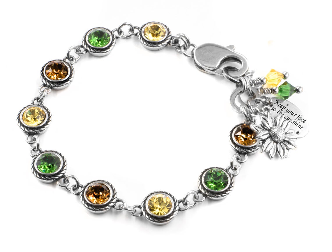 Keep your face to the sunshine in this twinkling multicolor Crystal Link Bracelet. Handcrafted art jewelry in beautiful and durable no tarnish Stainless Steel, curved links for comfort, won't snag clothing, adjustable for the perfect fit. Artist Crafted Jewelry, because how it's made, matters. You're one of a kind, this is your jewelry.